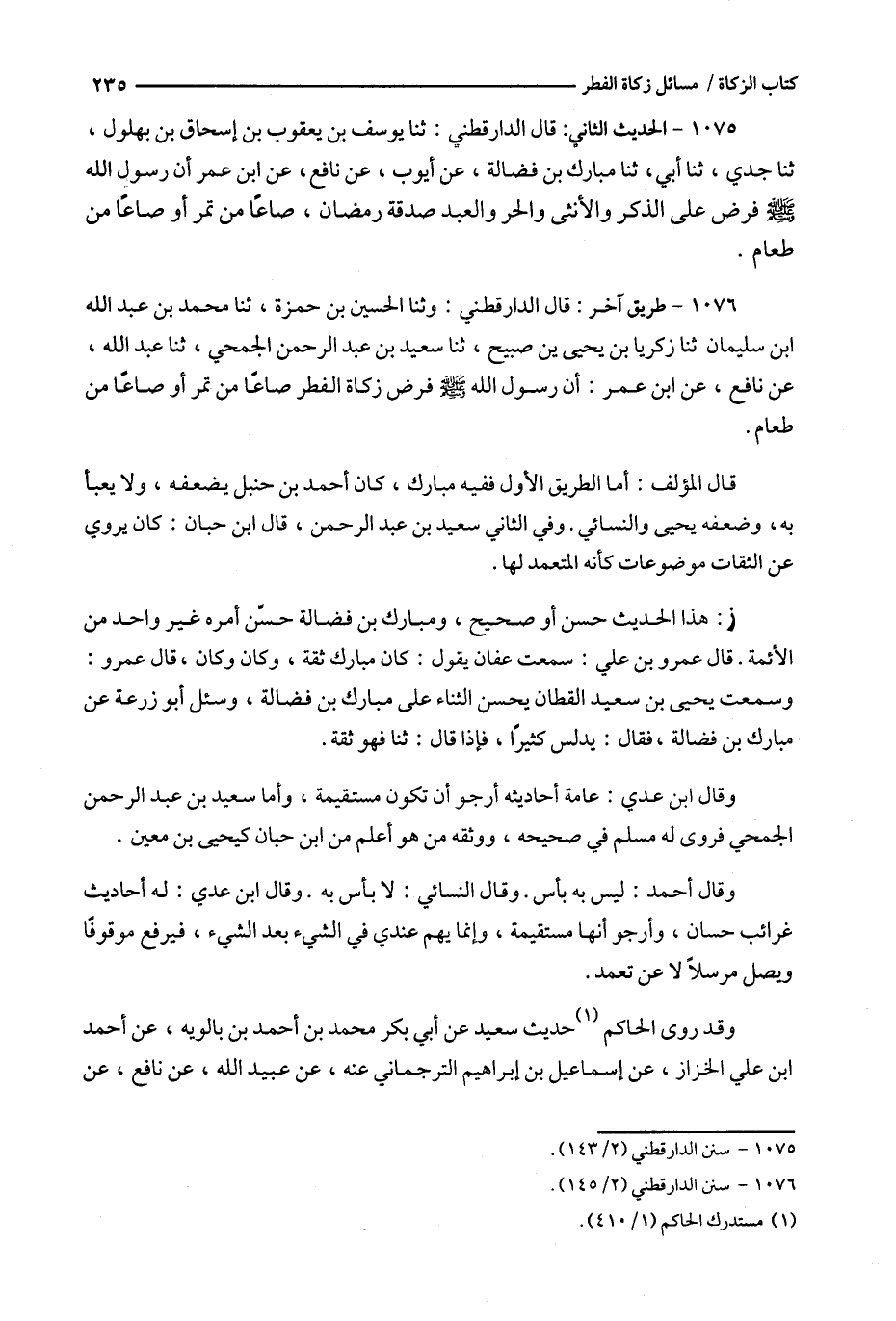 1076 - طريق آخر : قال الدارقطني : وثنا الحسين بن حمزة ، ثنا محمد بن عبد الله ابن سليمان ثنا زكريا بن يحي بن صبيح ، ثنا سعيد بن عبد الرحمن الجمحي ، ثنا عبد الله ، عن نافع ، عن ابن عمر : أن رسول الله فرض زكاة الفطر صاعا من تمر أو صاعا من طعام .