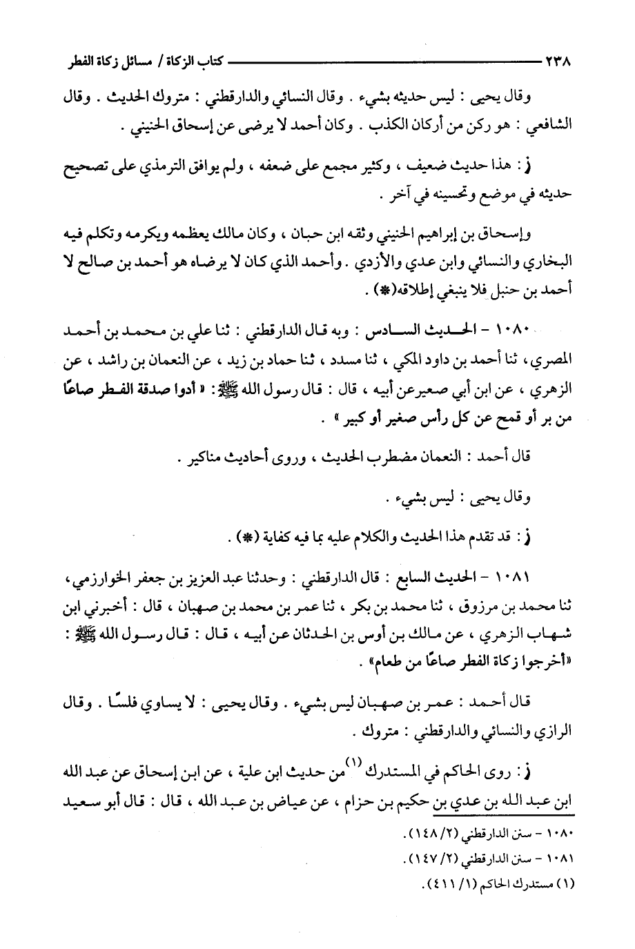 1080 - الحديث السادس : به وقال الدارقطني : ثنا علي بن محمد بن أحمد المصري ، ثنا أحمد بن داود المكي ، ثنا مسدد ، ثنا حماد بن زيد ، عن النعمان بن راشد ، عن الزهري ، عن ابن أبي صعير عن أبيه ، قال : قال رسول الله : ' أدوا صدقة الفطر صاعا من بر أو قمح عن كل رأس صغير أو كبير ' .
