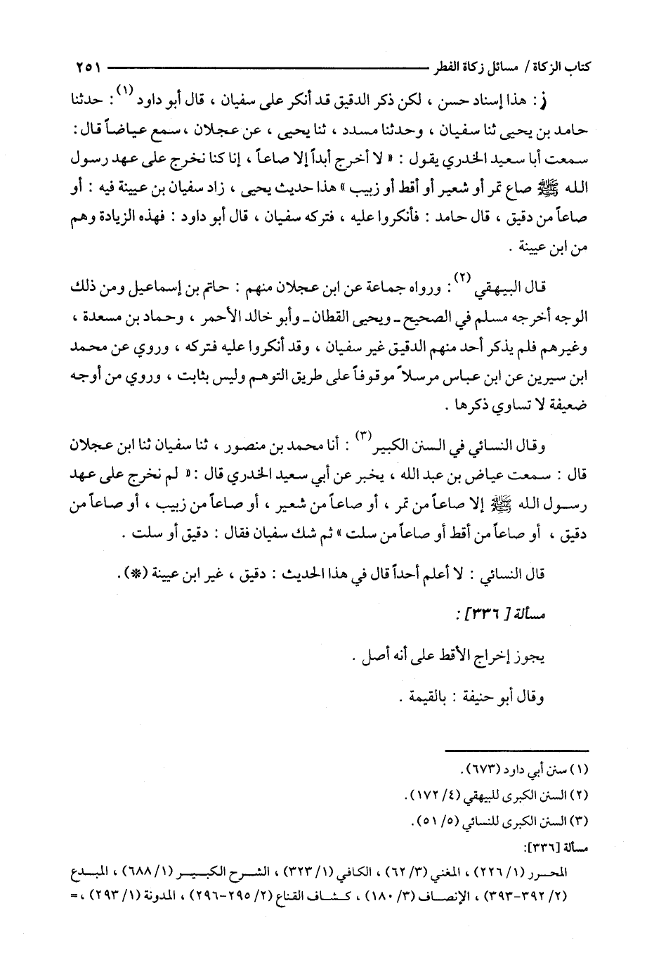 وقال النسائي في السنن الكبير : أنا محمد بن منصور ، ثنا سفيان ثنا ابن عجلان قال : سمعت عياض بن عبد الله ، يخبر عن أبي سعيد الخدري قال : ' لم نخرج على عهد رسول الله إلا صاعا من تمر ، أو صاعا من شعير ، أو صاعا من زبيب ، أو صاعا من دقيق ، أو صاعا من أقط أو صاعا من سلت ' ثم شك سفيان فقال : دقيق أو سلت .
