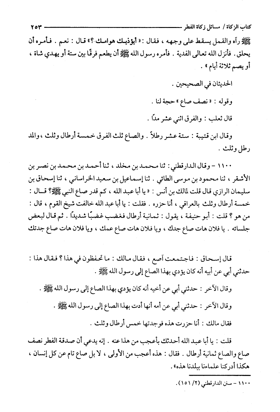 ثنا إسماعيل بن سعيد الخراساني ، ثنا إسحاق بن سليمان الرازي قال قلت لمالك بن أنس : ' يا أبا عبد الله ، كم قدر صاع النبي ؟ قال : خمسة أرطال وثلث بالعراقي ، أنا حزره .