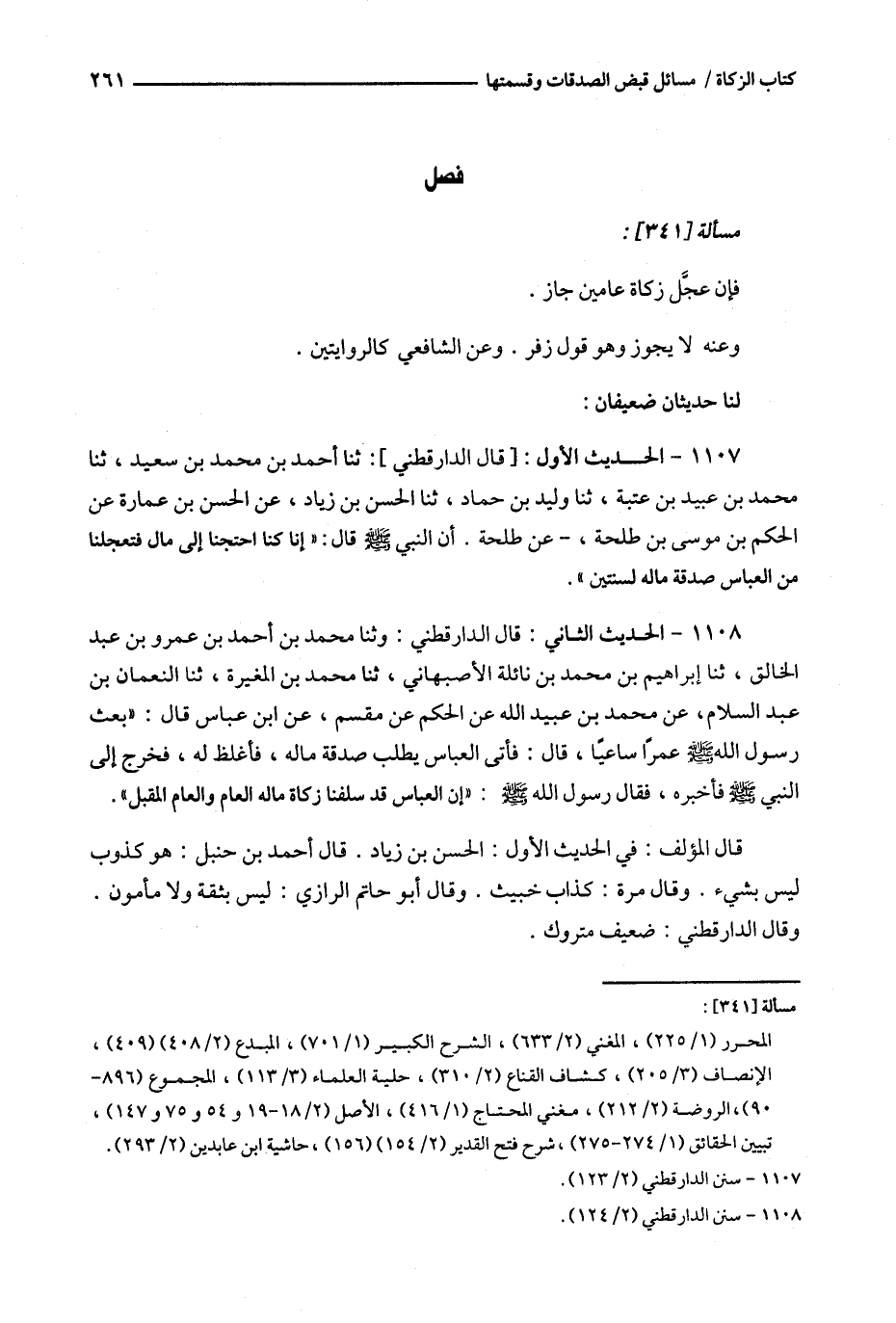 1107 - الحديث الأول : [ قال الدارقطني ] : ثنا أحمد بن محمد بن سعيد ، ثنا محمد بن عبيد بن عتبة ، ثنا وليد بن حماد ، ثنا الحسن بن زياد ، عن الحسن بن عمارة عن الحكم بن موسى بن طلحة ، - عن طلحة ، أن النبي قال : ' إنا كنا احتجنا إلى مال فتعجلنا من العباس صدقة ماله لسنتين ' .