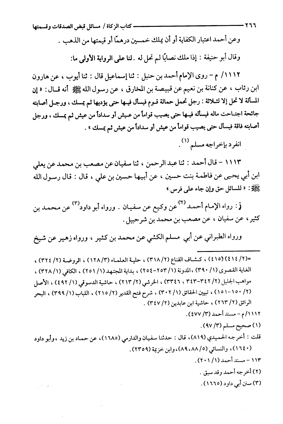 1112 / م - روى الإمام أحمد بن حنبل : ثنا إسماعيل قال : ثنا أيوب ، عن هارون ابن رئاب ، عن كنانة بن نعيم عن قبيصة بن المخارق ، عن رسول الله أنه قال : ' إن المسألة لا تحل إلا لثلاثة : رجل تحمل حمالة قوم فيسأل فيها حتى يؤديها ثم يمسك ، ورجل أصابته جائحة اجتاحت ماله فيسأله فيها حتى يصيب قواما من عيش أو سدادا من عيش ثم يمسك ، ورجل أصابته فاقة فيسأل حتى يصيب قواما من عيش أو سدادا من عيش ثم يمسك ' .