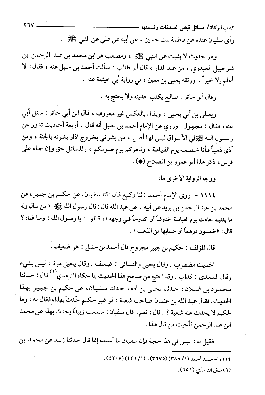 1114 - روى الإمام أحمد : ثنا وكيع قال : ثنا سفيان ، عن حكيم بن جبير ، عن محمد بن عبد الرحمن بن يزيد عن أبيه ، عن عبد الله قال : قال رسول الله ' من سأل وله ما يغنيه جاءت يوم القيامة خدوشا أو : كدوحا في وجهه ' ، قالوا : يا رسول الله : وما غناه ؟ قال : ' خمسون درهما أو حسابها من الذهب ' .