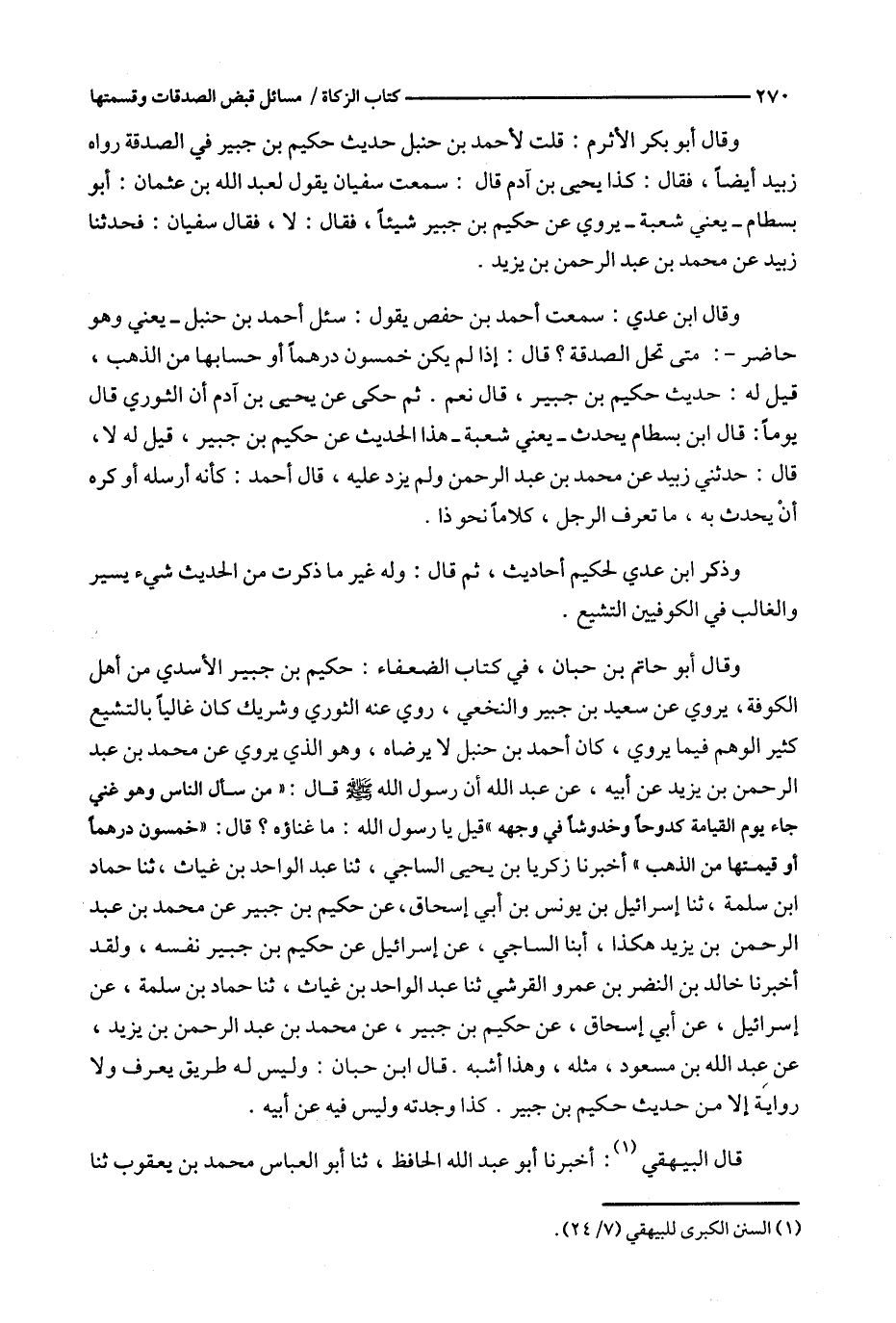 وقال أبو حاتم بن حبان ، في كتاب الضعفاء : حكيم بن جبير الأسدي من أهل الكوفة ، يروي عن سعيد بن جبير والنخعي ، روي عنه الثوري وشريك كان غاليا بالتشيع كثير الوهم فيما يروي ، كان أحمد بن حنبل لا يرضاه ، وهو الذي يروي عن محمد بن عبد الرحمن بن يزيد عن أبيه ، عن عبد الله أن رسول الله قال : ' من سال الناس وهو غني جاء يوم القيامة كدوحا وخدوشا في وجهه ' قيل يا رسول الله : ما غناؤه ؟ قال : ' خمسون درهما أو قيمتها من الذهب ' أخبرنا زكريا بن يحيى الساجي ، ثنا عبد الواحد بن غياث ، ثنا حماد ابن سلمة ، ثنا إسرائيل بن يونس بن أبي إسحاق ، عن حكيم بن جبير عن محمد بن عبد الرحمن بن يزيد هكذا ، ابنا الساجي ، عن إسرائيل عن حكيم بن جبير نفسه ، ولقد أخبرنا خالد بن النضر بن عمرو القرشي ثنا عبد الواحد بن غياث ، ثنا حماد بن سلمة ، عن إسرائيل ، عن أبي إسحاق ، عن حكيم بن جبير ، عن محمد بن عبد الرحمن بن يزيد ، عن عبد الله بن مسعود ، مثله ، وهذا أشبه .