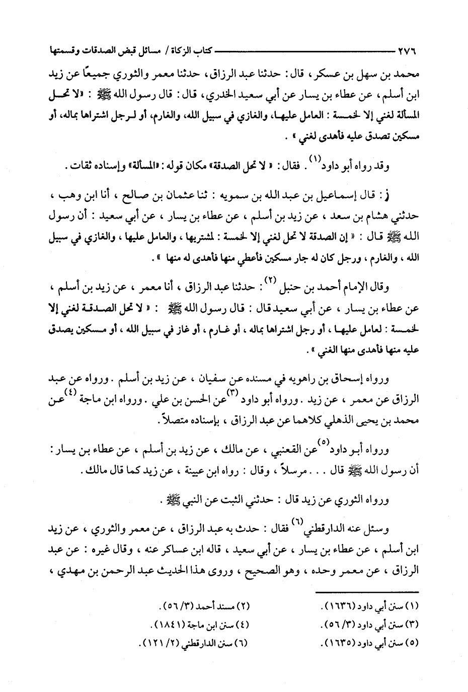 وقال الإمام أحمد بن حنبل : حدثنا عبد الرزاق ، أنا معمر ، عن زيد بن أسلم ، عن عطاء بن يسار ، عن أبي سعيد قال : قال رسول الله : ' لا تحل الصدقة لغني إلا لخمسة : لعامل عليها ، أو رجل اشتراها بماله ، أو غارم ، أو غاز في سبيل الله ، أو مسكين يصدق عليه منها فأهدى منها الغني ' .
