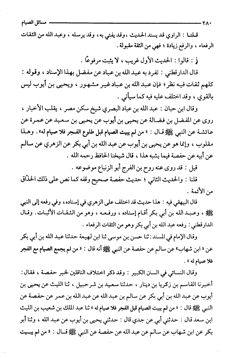 وقال النسائي في السنن الكبير : وقد ذكر اختلاف الناقلين لخبر حفصة ، فقال : أخبرنا القاسم بن زكريا بن دينار ، حدثنا سعيد بن شرحبيل ، ثنا الليث عن يحي بن أيوب عن عبد الله بن أبي بكر عن سالم بن عبد الله عن عبد الله بن عمر عن حفصة عن النبي قال : ' من لم يبيت الصيام قبل الفجر فلا صيام له ' ثنا عبد الملك بن شعيب بن الليث ابن سعد قال : حدثني أبي عن جدي قال : حدثني يحي بن أيوب عن عبد الله ، وثنا أبو بكر عن ابن شهاب عن سالم عن عبد الله عن حفصة عن النبي قال : ' من لم يبيت
