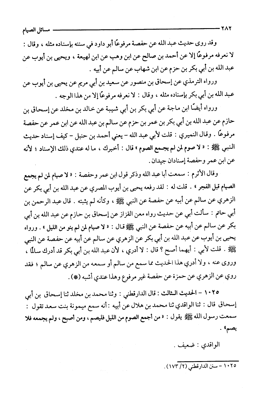 وقال النميري : قلت لأبي عبد الله - يعني أحمد بن حنبل - كيف إسناد حديث النبي : ' لا صوم لمن لم يجمع الصوم ' قال : أخبرك ، ما له عندي ذلك الإسناد ؛ لأنه عن ابن عمر وحفصة إسنادان جيدان .