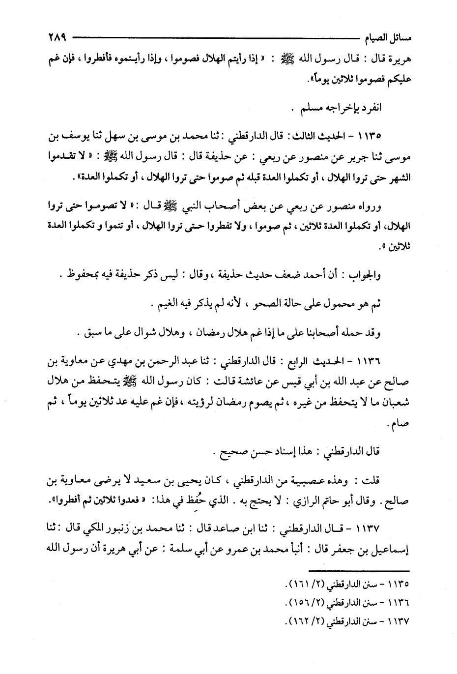 1135 - الحديث الثالث : قال الدارقطني : ثنا محمد بن موسى بن سهل ثنا يوسف بن موسى ثنا جرير عن منصور عن ربعي : عن حذيفة قال : قال رسول الله : ' لا تقدموا الشهر حتى تروا الهلال ، أو تكملوا العدة قبله ثم صوموا حتى تروا الهلال ، أو تكملوا العدة ' .