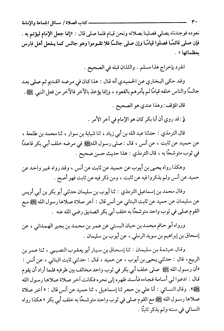 قال الترمذي : حدثنا عبد الله بن أبي زياد ، ثنا شبابة بن سوار ، ثنا محمد بن طلحة ، عن حميد عن ثابت ، عن أنس ، قال : صلى رسول الله في مرضه خلف أبي بكر قاعدا في ثوب متوشحا به ، قال الترمذي : هذا حديث حسن صحيح .