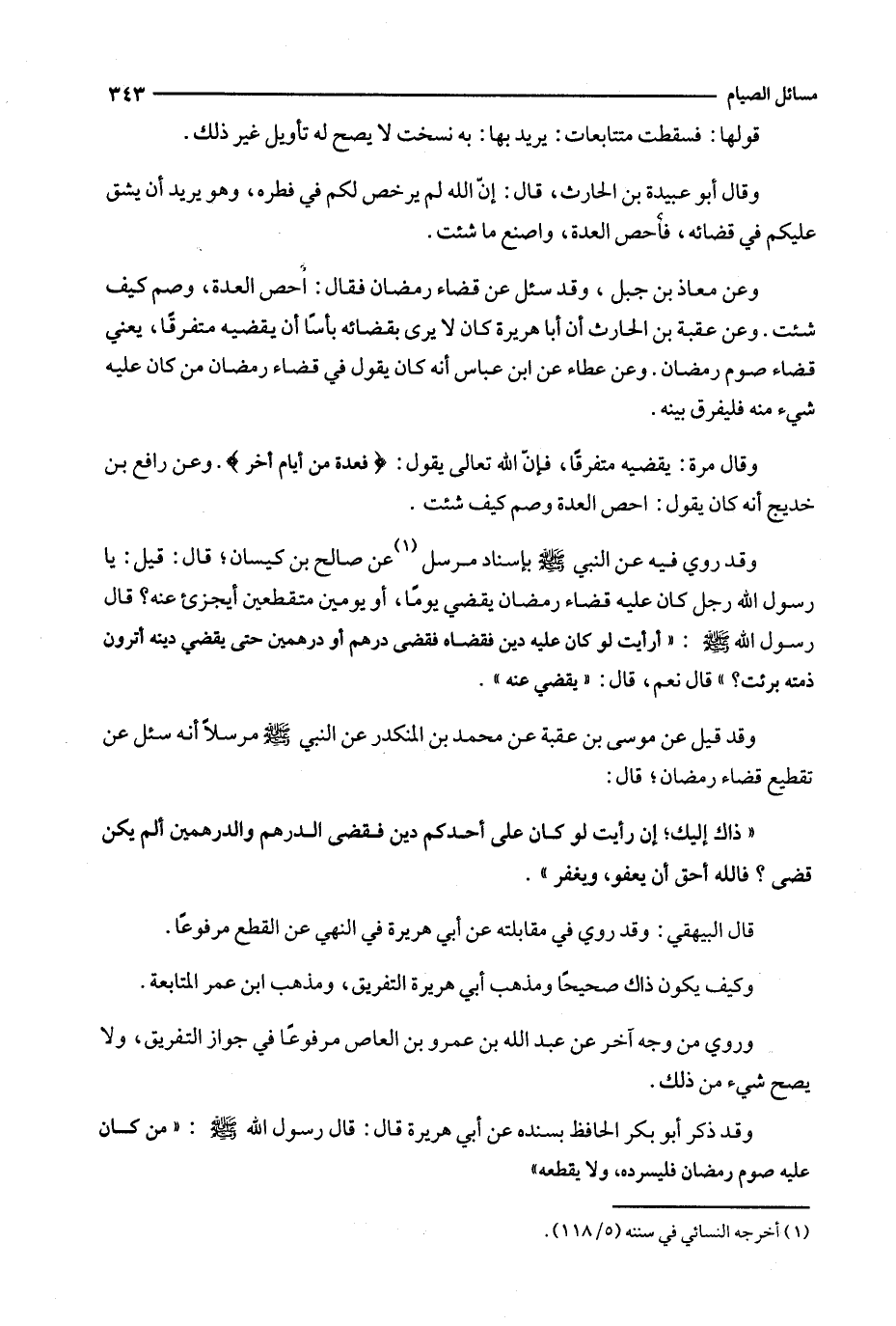 وقد ذكر أبو بكر الحافظ بسنده عن أبي هريرة قال : قال رسول الله : ' من كان عليه صوم رمضان فليسرده ، ولا يقطعه '