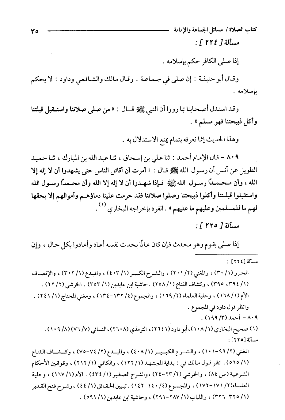 809 - قال الإمام أحمد : ثنا علي بن إسحاق ، ثنا عبد اللهبن المبارك ، ثنا حميد الطويل عن أنس أن رسول الله قال : ' أمرت أن أقاتل الناس حتى يشهدوا أن لا إله إلا الله ، وأن محمدا رسول الله فإذا شهدوا أن لا إله إلا الله وأن محمدا رسول الله واستقبلوا قبلتنا وأكلوا ذبيحتنا وصلوا صلاتنا فقد حرمت علينا دماؤهم وأموالهم إلا بحقها لهم ما للمسلمين وعليهم ما عليهم ' . انفرد بإخراجه البخاري .