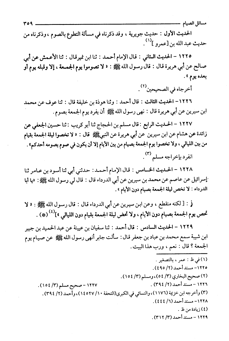 1225 - الحديث الثاني : قال الإمام أحمد : ثنا ابن نمير قال : ثنا الأعمش عن أبي صالح عن أبي هريرة قال : قال رسول الله : ' لا تصوموا يوم الجمعة ، إلا وقبله يوم أو بعده يوم ' .