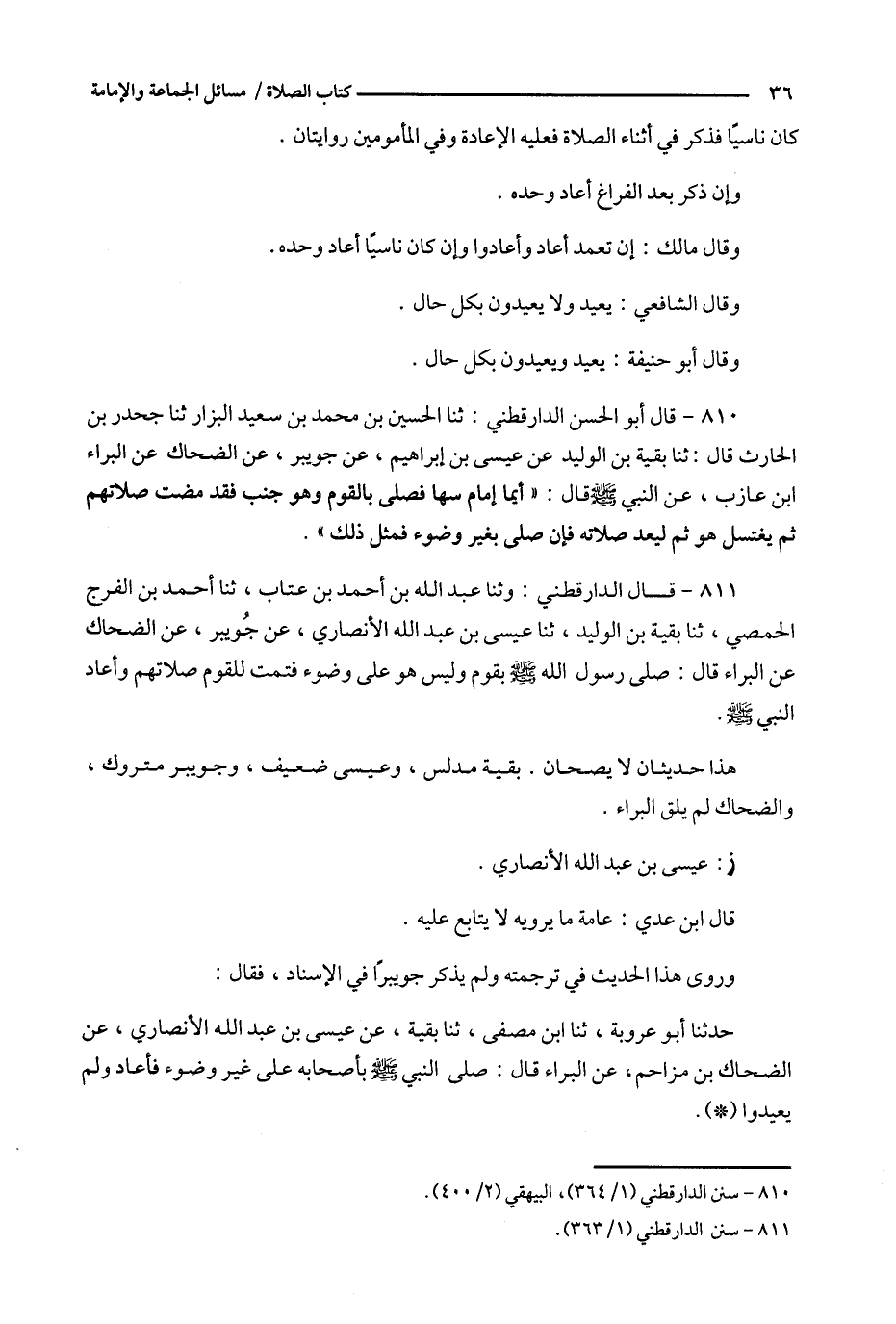 811 - قال الدارقطني : وثنا عبد الله بن أحمد بن عتاب ، ثنا أحمد بن الفرج الحمصي ، ثنا بقية بن الوليد ، ثنا عيسى بن عبد الله الأنصاري ، عن جويبر ، عن الضحاك عن البراء قال : صلى رسول الله بقوم وليس هو على وضوء فتمت للقوم صلاتهم وأعاد النبي .