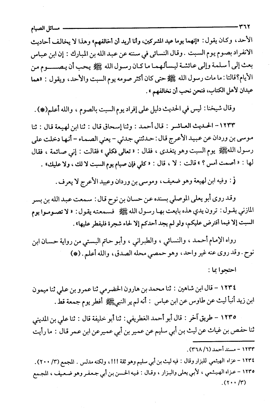 1233 - الحديث العاشر : قال أحمد : وثنا إسحاق قال : ثنا ابن لهيعة قال : ثنا موسى بن وردان عن عبيد الأعرج قال : حدثتني جدتي - يعني الصماء - أنها دخلت على رسول الله يوم السبت وهو يتغدى ، فقال : ' تعالى فكلي ' فقالت : إني صائمة ، فقال لها : ' أصمت أمس ؟ ' قالت : لا ، قال : ' كلي فإن صيام يوم السبت لا لك ، ولا عليك ' .