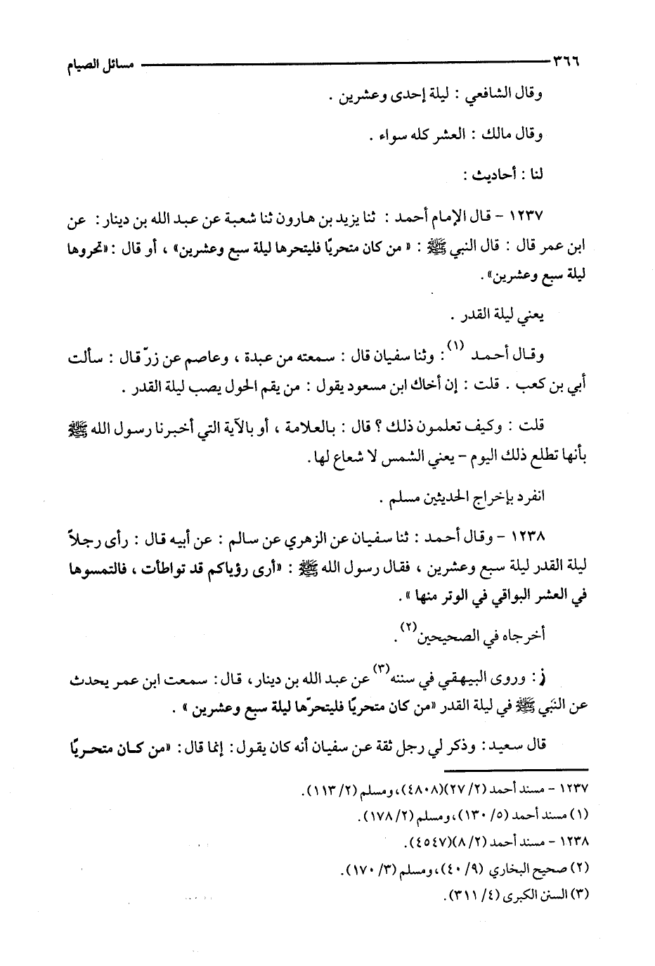 1237 - قال الإمام أحمد : ثنا يزيد بن هارون ثنا شعبة عن عبد الله بن دينار : عن ابن عمر قال : قال النبي : ' من كان متحريا فليتحرها ليلة سبع وعشرين ' ، أو قال : ' تحروها ليلة سبع وعشرين ' .