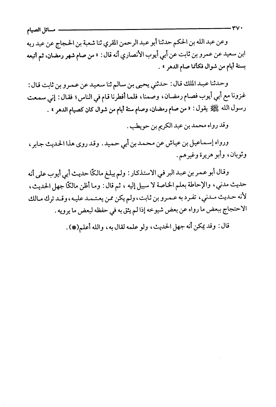 وعن عبد الله بن الحكم حدثنا أبو عبد الرحمن المقري ثنا شعبة بن الحجاج عن عبد ربه ابن سعيد عن عمرو بن ثابت عن أبي أيوب الأنصاري أنه قال : ' من صام شهر رمضان ، ثم أتبعه بستة أيام من شوال فكأنما صام الدهر ' .