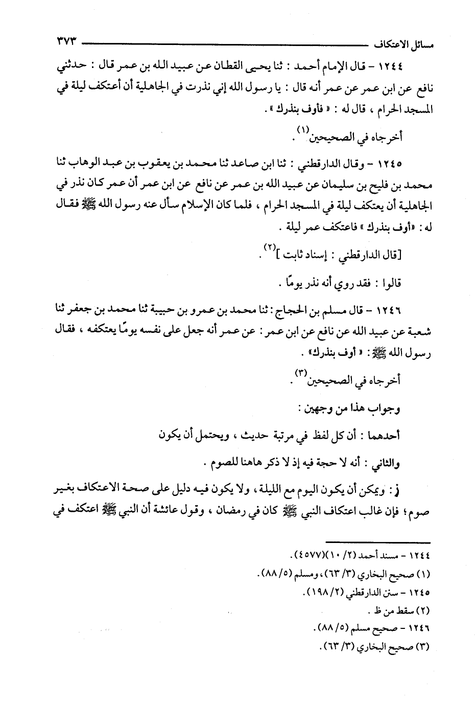 1246 - قال مسلم بن الحجاج : ثنا محمد بن عمرو بن حبيبة ثنا محمد بن جعفر ثنا شعبة عن عبيد الله عن نافع عن ابن عمر : عن عمر أنه جعل على نفسه يوما يعتكفه ، فقال رسول الله : ' أوف بنذرك '