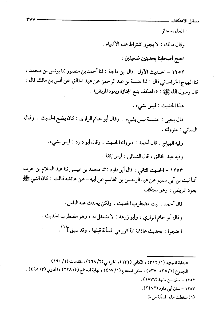 1252 - الحديث الأول : قال ابن ماجه : ثنا أحمد بن منصور ثنا يونس بن محمد ، ثنا الهياج الخراساني قال : ثنا عنبسة بن عبد الرحمن عن عبد الخالق عن أنس بن مالك قال : قال رسول الله : ' المعتكف يتبع الجنازة ويعود المريض ' .