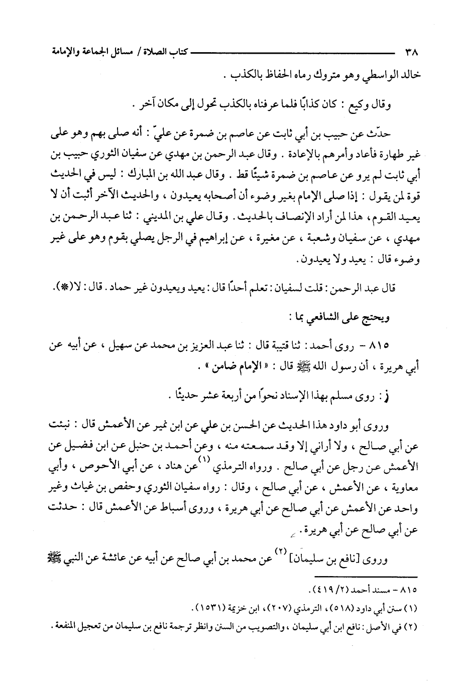 815 - روى أحمد : ثنا قتيبة قال : ثنا عبد العزيز بن محمد عن سهيل ، عن أبيه عن أبي هريرة ، أن رسول الله قال : ' الإمام ضامن ' .
