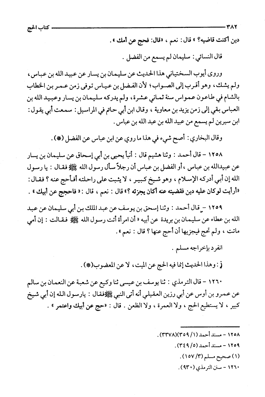 1259 - قال أحمد : وثنا إسحاق بن يوسف عن عبد الملك بن أبي سليمان عن عبد الله بن عطاء عن سليمان بن بريدة عن أبيه ' أن امرأة أتت رسول الله فقالت : إن أمي ماتت ، ولم تحج فيجزيها أن أحج عنها ؟ قال : نعم ' .