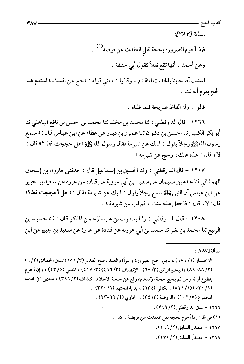 1266 - قال الدارقطني : ثنا محمد بن مخلد ثنا محمد بن الحسن بن نافع الباهلي ثنا أبو بكر الكلبي ثنا الحسن بن ذكوان ثنا عمرو بن دينار عن عطاء عن ابن عباس قال : ' سمع رسول الله رجلا يقول : لبيك عن شبرمة فقال رسول الله ' هل حججت قط ؟ ' قال : لا ، قال : هذه عنك ، وحج عن شبرمة '
