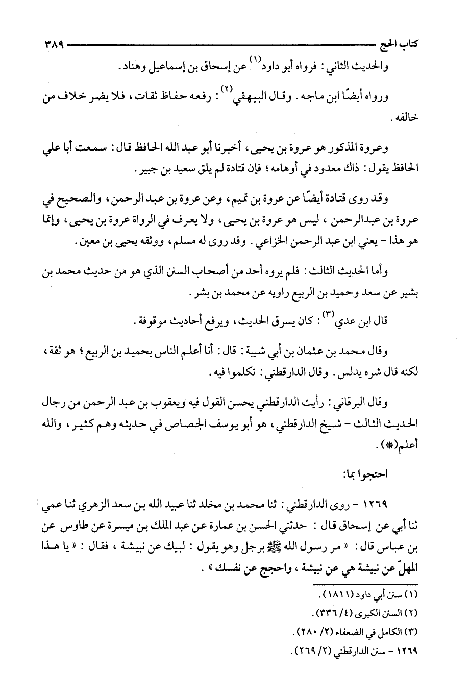 1269 - روى الدارقطني : ثنا محمد بن مخلد ثنا عبيد الله بن سعد الزهري ثنا عمي ثنا أبي عن إسحاق قال : حدثني الحسن بن عمارة عن عبد الملك بن ميسرة عن طاوس عن بن عباس قال : ' مر رسول الله برجل وهو يقول : لبيك عن نبيشة ، فقال : ' يا هذا المهل عن نبيشة هي عن نبيشة ، واحجج عن نفسك ' .