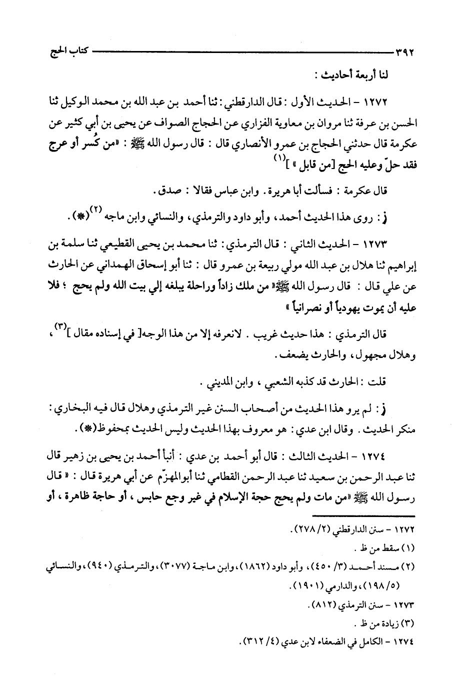1273 - الحديث الثاني : قال الترمذي : ثنا محمد بن يحي القطيعي ثنا سلمة بن إبراهيم ثنا هلال بن عبد الله مولى ربيعة بن عمرو قال : ثنا أبو إسحاق الهمداني عن الحارث عن علي قال : قال رسول الله ' من ملك زادا وراحلة يبلغه إلي بيت الله ولم يحج ؛ فلا عليه أن يموت يهوديا أو نصرانيا '