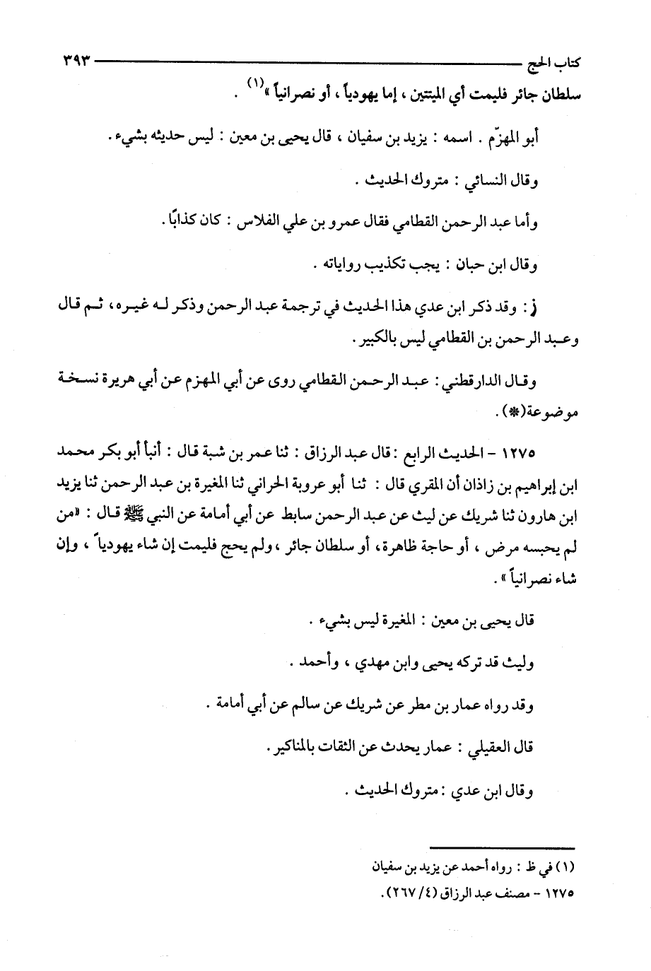 1275 - الحديث الرابع : قال عبد الرزاق : ثنا عمر بن شبة قال : أنبأ أبو بكر محمد بن إبراهيم بن زاذان أن المقري قال : ثنا أبو عروبة الحراني ثنا المغيرة بن عبد الرحمن ثنا يزيد ابن هارون ثنا شريك عن ليث عن عبد الرحمن سابط عن أبي أمامة عن النبي قال : ' من لم يحبسه مرض ، أو حاجة ظاهرة ، أو سلطان جائر ، ولم يحج فليمت إن شاء يهوديا ، وإن شاء نصرانيا ' .