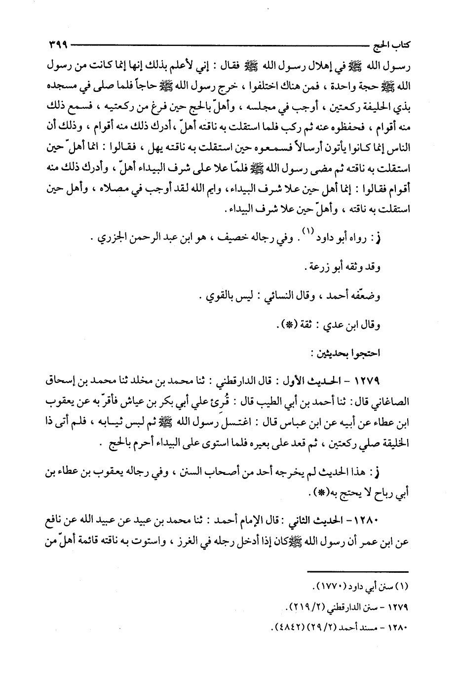 1279 - الحديث الأول : قال الدارقطني : ثنا محمد بن مخلد ثنا محمد بن إسحاق الصاغاني قال : ثنا أحمد بن أبي الطيب قال : قرىء علي أبي بكر بن عياش فأقر به عن يعقوب ابن عطاء عن أبيه عن ابن عباس قال : اغتسل رسول الله ثم لبس ثيابه ، فلم أتى ذا الخليقة صلي ركعتين ، ثم قعد على بعيره فلما استوى على البيداء أحرم بالحج .