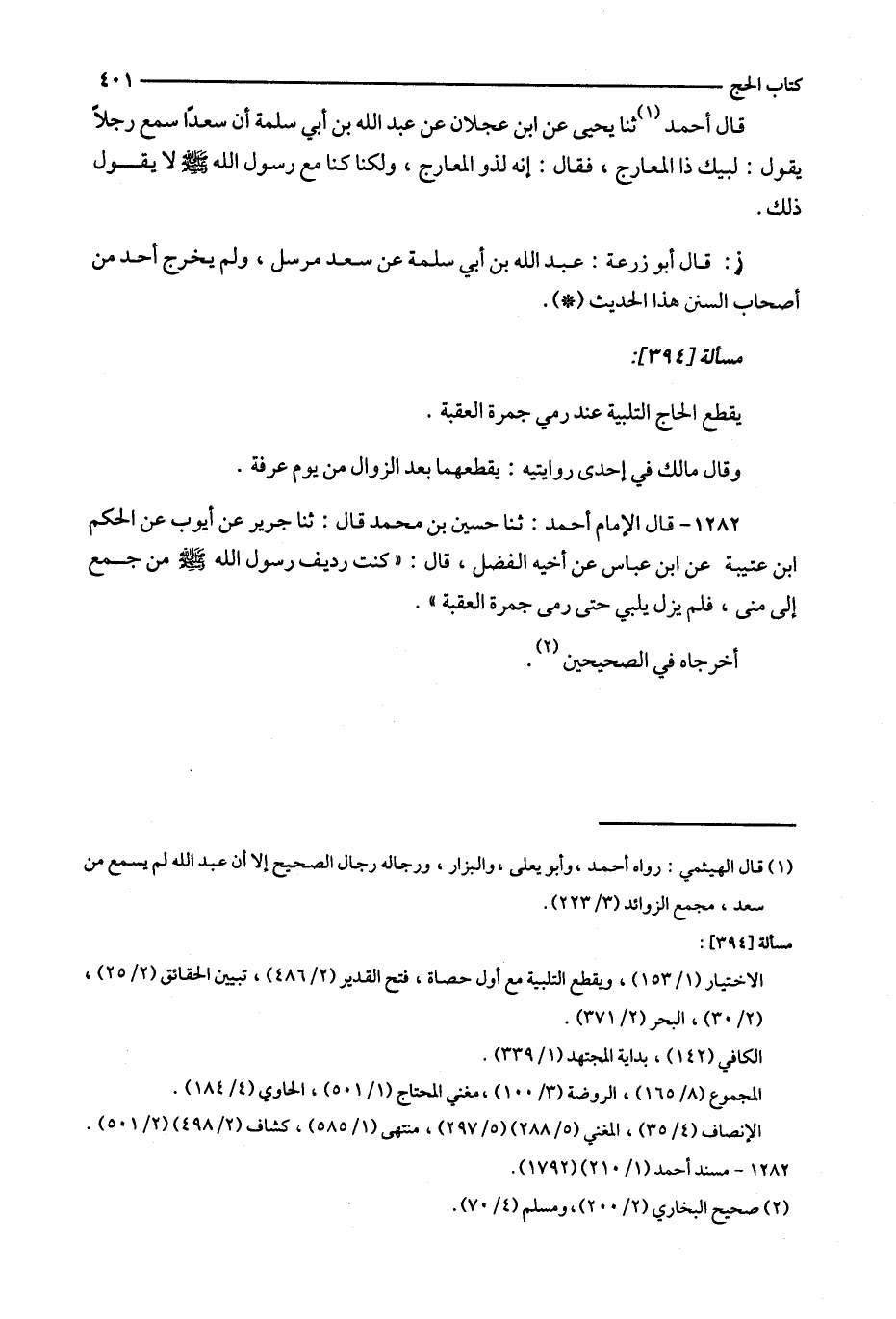 1282 - قال الإمام أحمد : ثنا حسين بن محمد قال : ثنا جرير عن أيوب عن الحكم ابن عتيبة عن ابن عباس عن أخيه الفضل ، قال : ' كنت رديف رسول الله من جمع إلى منى ، فلم يزل يلبي حتى رمى جمرة العقبة ' .