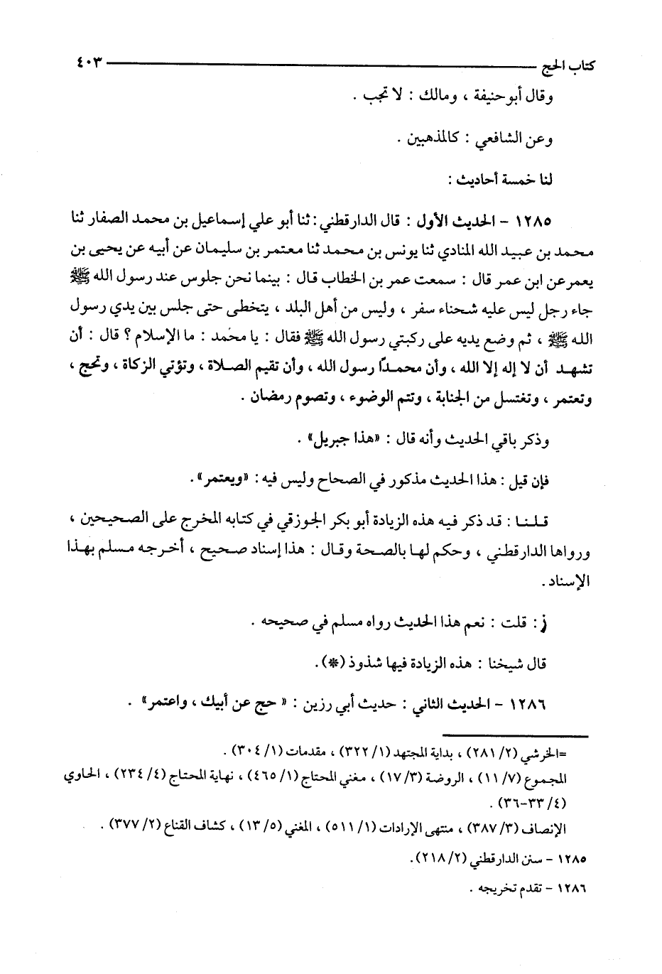 1285 : الحديث الأول : قال الدارقطني : ثنا أبو علي إسماعيل بن محمد الصفار ثنا محمد بن عبيد الله المنادي ثنا يونس بن محمد ثنا معتمر بن سليمان عن أبيه عن يحي بن يعمر عن ابن عمر قال : سمعت عمر بن الخطاب قال : بينما نحن جلوس عند رسول الله جاء رجل ليس عليه شحناء سفر ، وليس من أهل البلد ، يتخطى حتى جلس بين يدي رسول الله ، ثم وضع يديه على ركبتي رسول الله فقال : يا محمد : ما الإسلام ؟ قال : أن تشهد أن لا إله إلا الله ، وأن محمدا رسول الله ، وأن تقيم الصلاة ، وتؤتي الزكاة ، وتحج ، وتعتمر ، وتغتسل من الجنابة ، وتتم الوضوء ، وتصوم رمضان .