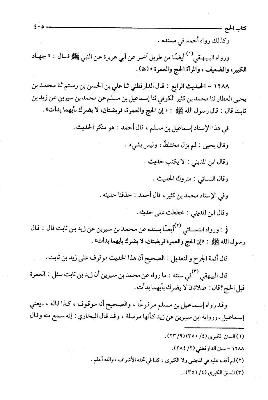 1288 - الحديث الرابع : قال الدارقطني ثنا علي بن الحسن بن رستم ثنا محمد بن يحيى العطار ثنا محمد بن كثير الكوفي ثنا إسماعيل بن مسلم عن محمد بن سيرين عن زيد بن ثابت قال : قال رسول الله : ' إن الحج والعمرة ، فريضتان ، لا يضرك بأيهما بدأت ' .