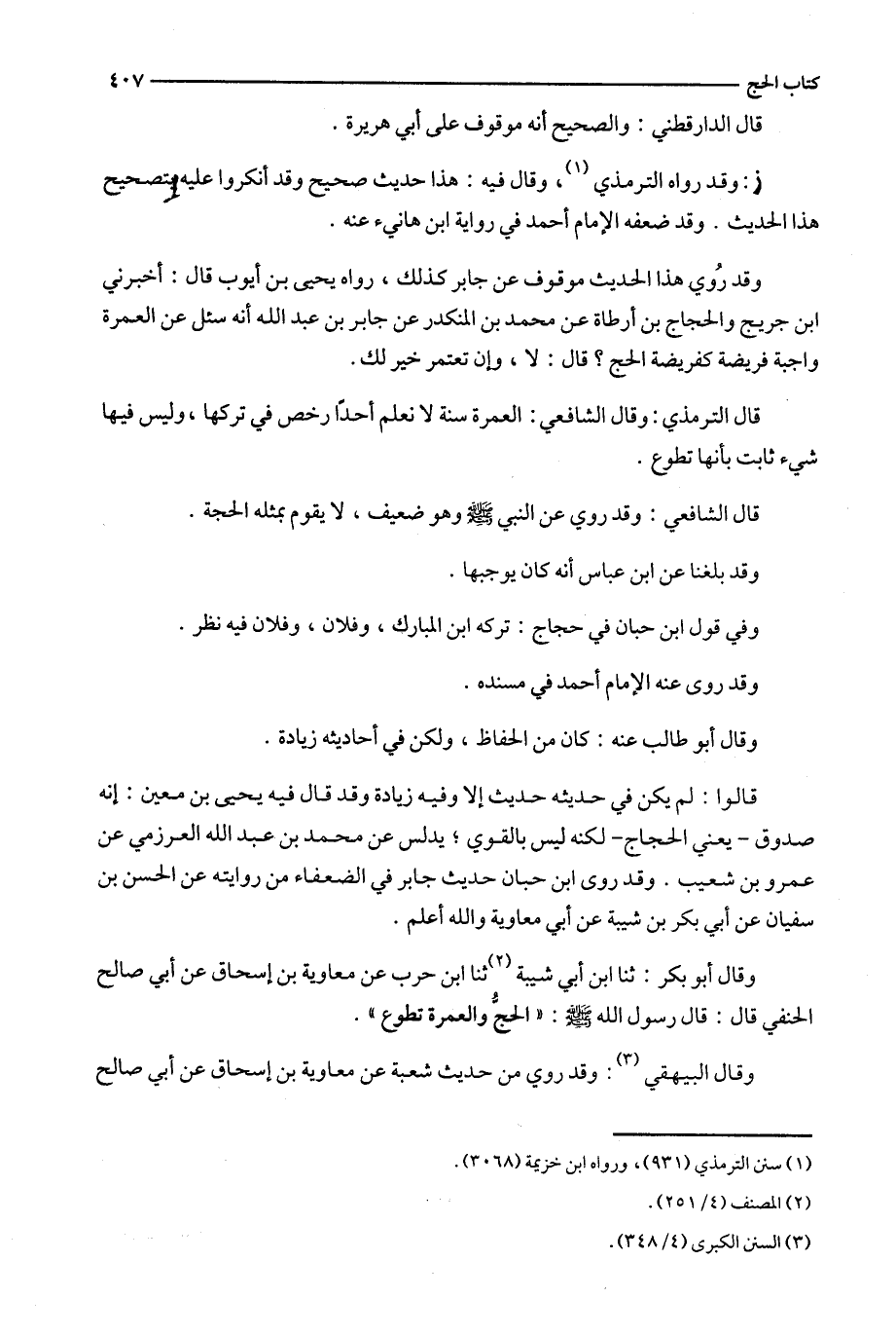 وقد روي هذا الحديث موقوف عن جابر كذلك ، رواه يحيى بن أيوب قال : أخبرني ابن جريج والحجاج بن أرطأة عن محمد بن المنكدر عن جابر بن عبد الله أنه سئل عن العمرة واجبة فريضة كفريضة الحج ؟ قال : لا ، وإن نعتمر خير لك .