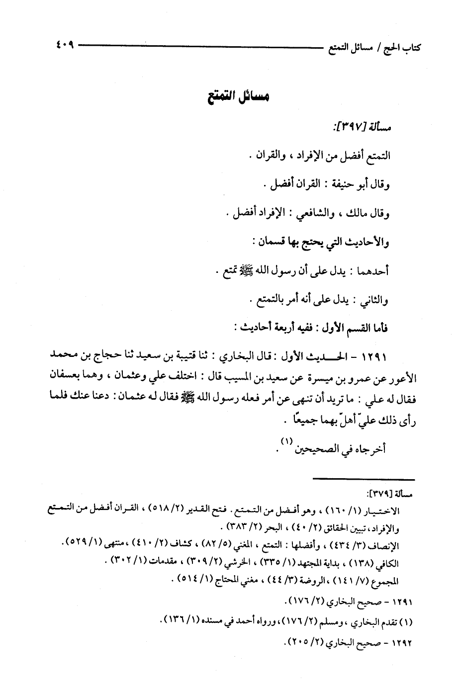 1291 - الحديث الأول : قال البخاري : ثنا قتيبة بن سعيد ثنا حجاج بن محمد الأعور عن عمرو بن ميسرة عن سعيد بن المسيب قال : اختلف علي وعثمان ، وهما بعسفان فقال له علي : ما تريد أن تنهى عن أمر فعله رسول الله فقال له عثمان : دعنا عنك فلما رأى ذلك علي أهل بهما جميعا .