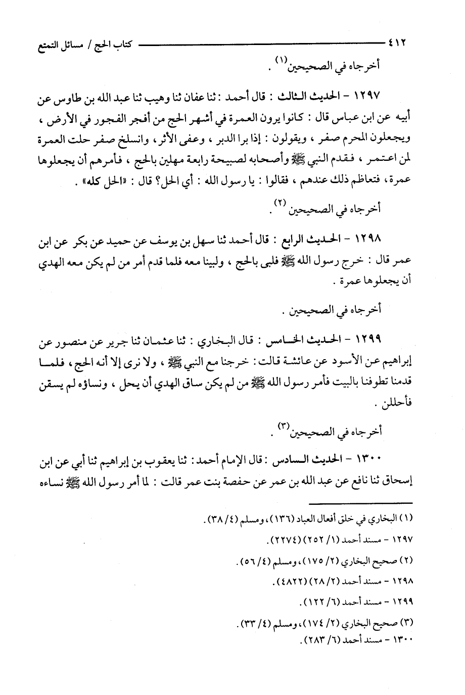 1297 - الحديث الثالث : قال أحمد : ثنا عفان ثنا وهيب ثنا عبد الله بن طاوس عن أبيه عن ابن عباس قال : كانوا يرون العمرة في أشهر الحج من أفجر الفجور في الأرض ، ويجعلون المحرم صفر ، ويقولون : إذا برا الدبر ، وعفى الأثر ، وانسلخ صفر حلت العمرة لمن اعتمر ، فقدم النبي وأصحابه لصبيحة رابعة مهلين بالحج ، فأمرهم أن يجعلوها عمرة ، فتعاظم ذلك عندهم ، فقالوا : يا رسول الله : أي الحل ؟ قال : ' الحل كله ' .