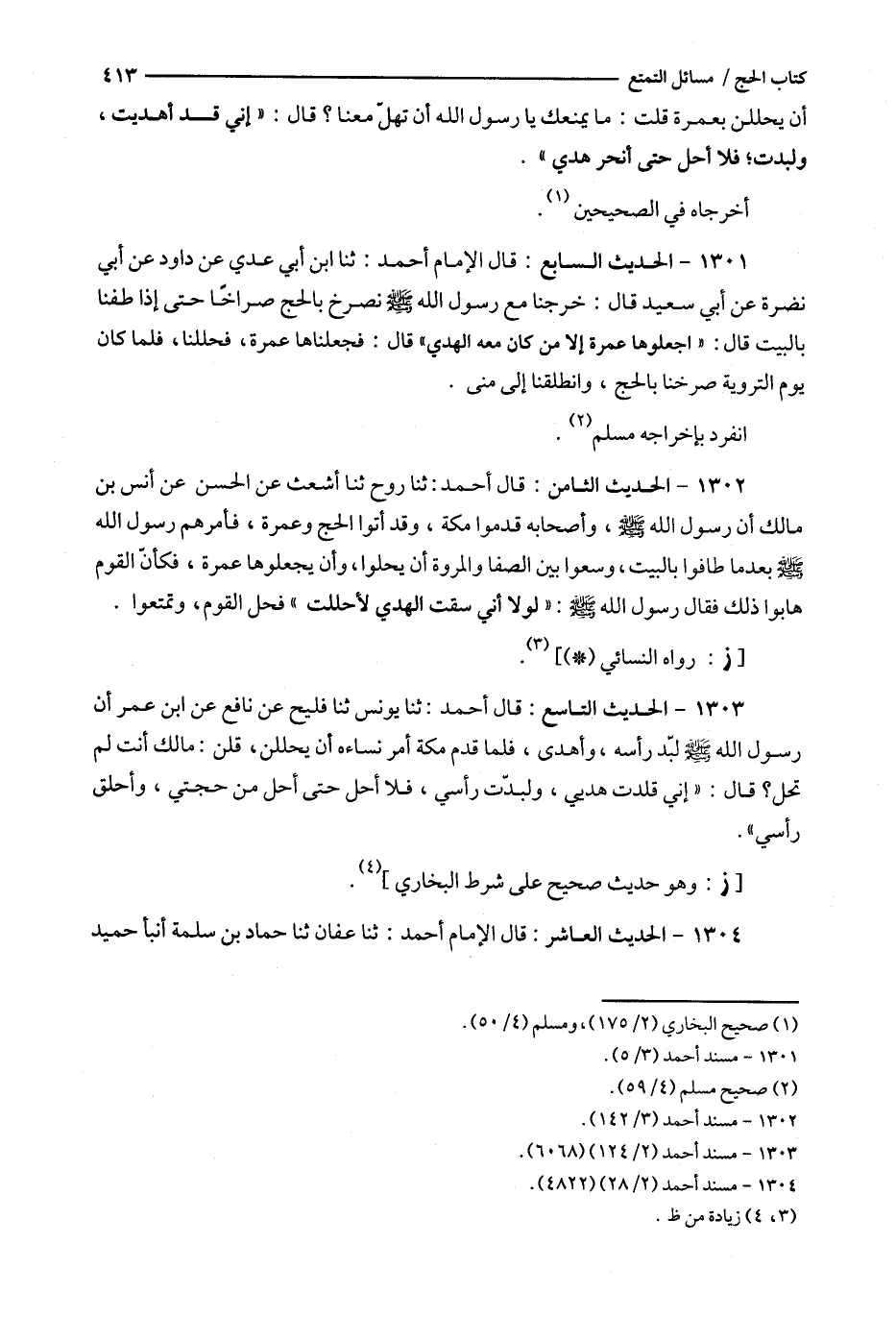 1302 - الحديث الثامن : قال أحمد : ثنا روح ثنا أشعث عن الحسن عن أنس بن مالك أن رسول الله ، وأصحابه قدموا مكة ، وقد أتوا الحج وعمرة ، فأمرهم رسول الله بعدما طافوا بالبيت ، وسعوا بين الصفا والمروة أن يحلوا ، وأن يجعلوها عمرة ، فكأن القوم هابوا ذلك فقال رسول الله : ' لولا أني سقت الهدي لأحللت ' فحل القوم ، وتمتعوا .