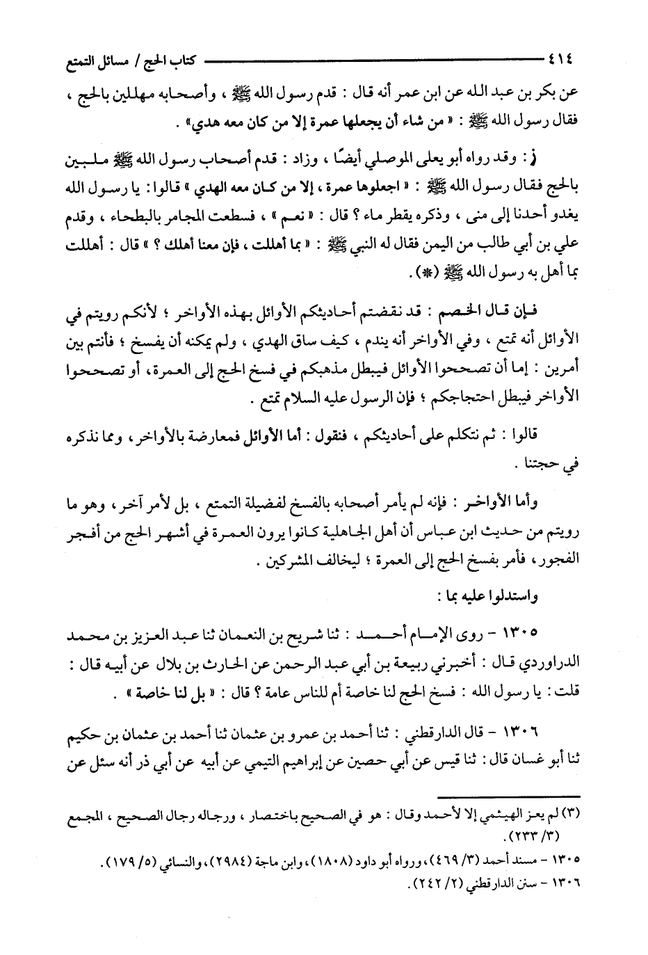 1305 - روى الإمام أحمد : ثنا شريح بن النعمان ثنا عبد العزيز بن محمد الدراوردي قال : أخبرني ربيعة بن أبي عبد الرحمن عن الحارث بن بلال عن أبيه قال : قلت : يا رسول الله : فسخ الحج لنا خاصة أم للناس عامة ؟ قال : ' بل لنا خاصة ' .