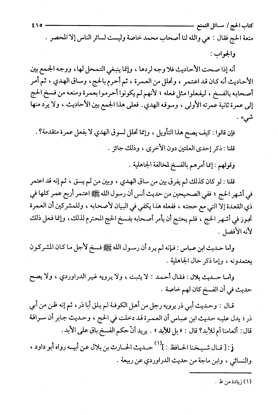 قال : وحديث أبي ذر يرويه رجل من أهل الكوفة لم يلق أبا ذر ، ثم إنه ظن من أبي ذر ؛ يدل عليه حديث ابن عباس أن العمرة قد دخلت في الحج ، وحديث جابر أن سراقة قال : ألعامنا أم للأبد ؟ قال : ' بل للأبد ' .