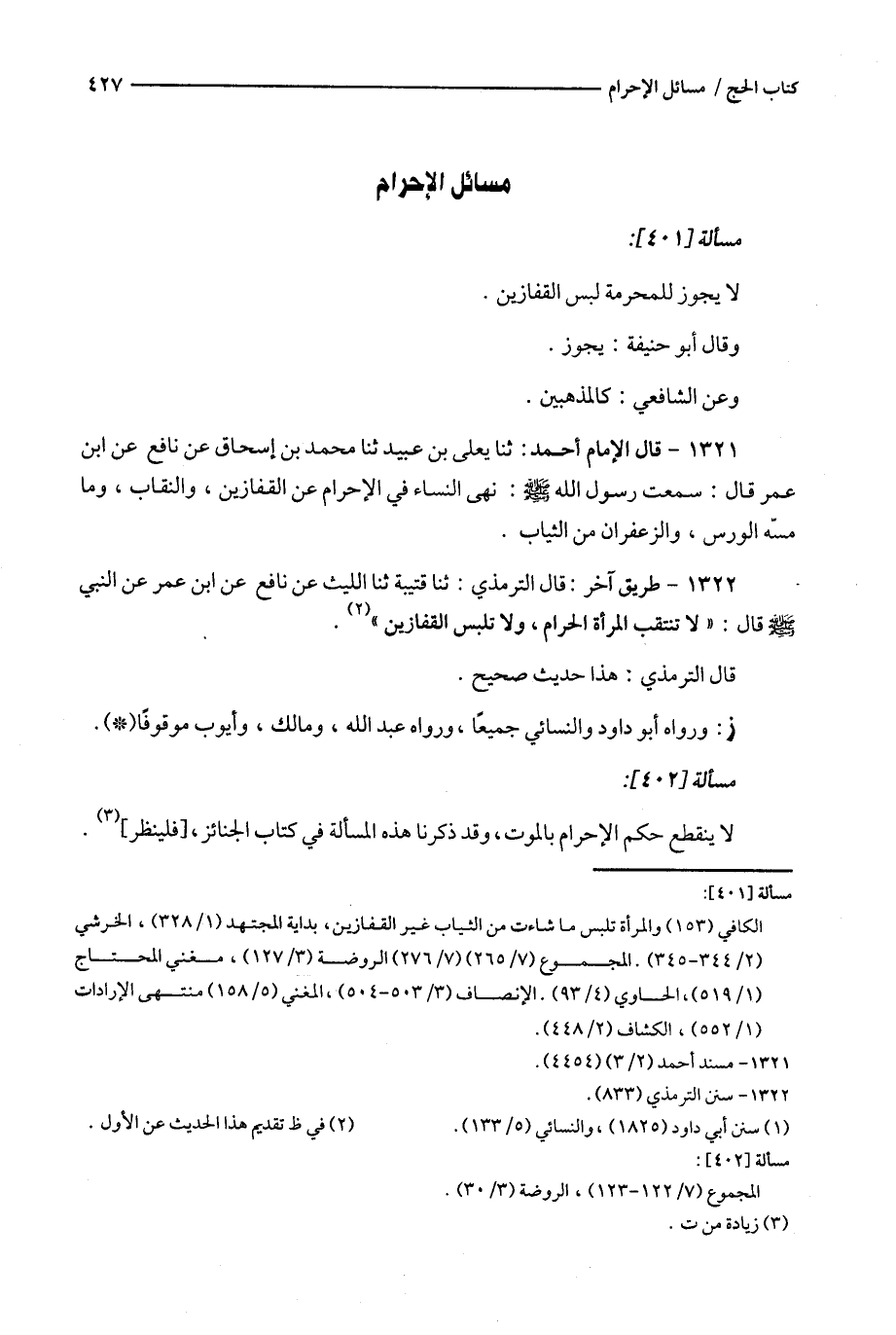 1322 - طريق آخر : قال الترمذي : ثنا قتيبة ثنا الليث عن نافع عن ابن عمر عن النبي قال : ' لا تنتقب المرأة الحرام ، ولا تلبس القفازين ' .