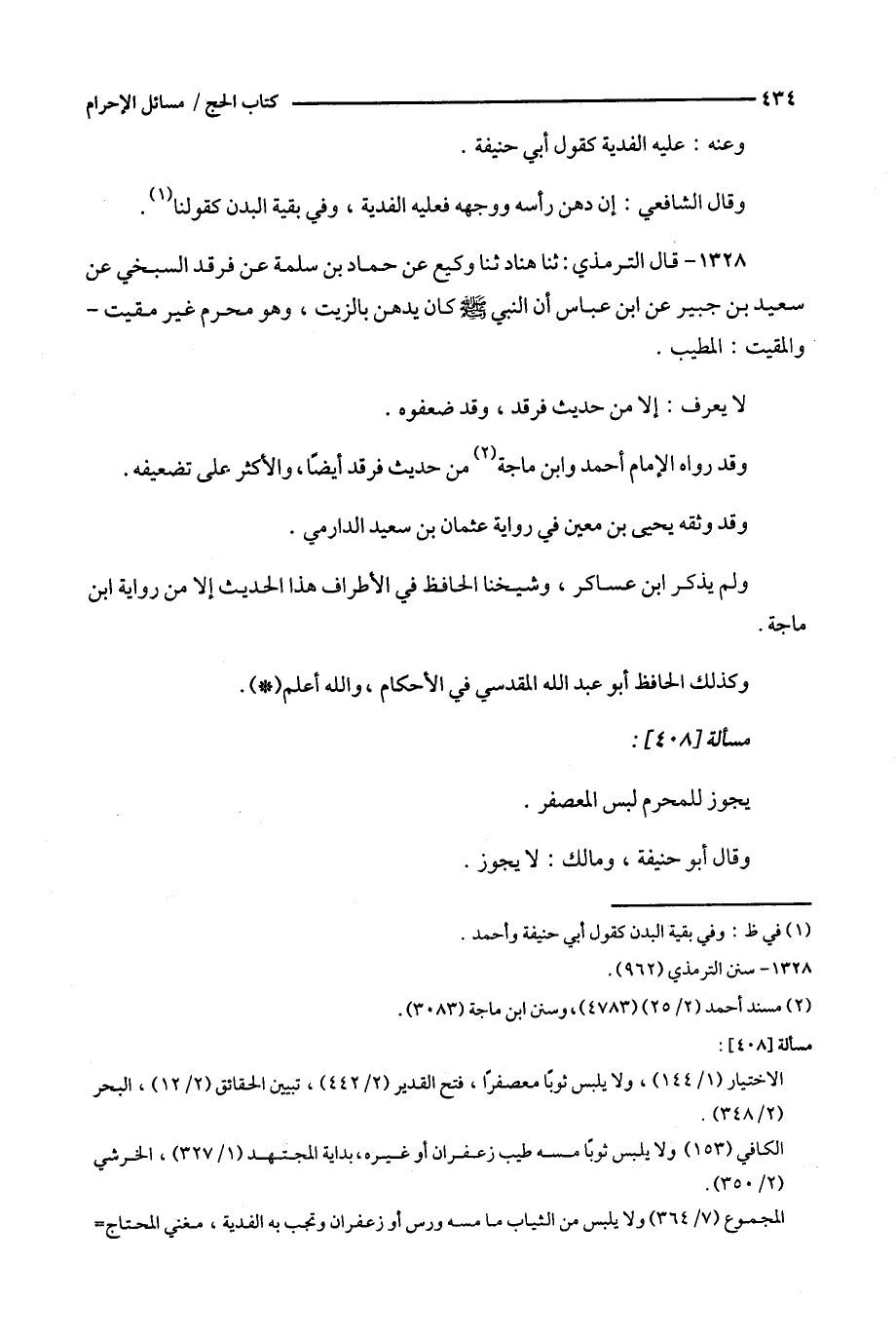 1328 - قال الترمذي : ثنا هناد ثنا وكيع عن حماد بن سلمة عن فرقد السبخي عن سعيد بن جبير عن ابن عباس أن النبي كان يدهن بالزيت ، وهو محرم غير مقيت - والمقيت : المطيب .