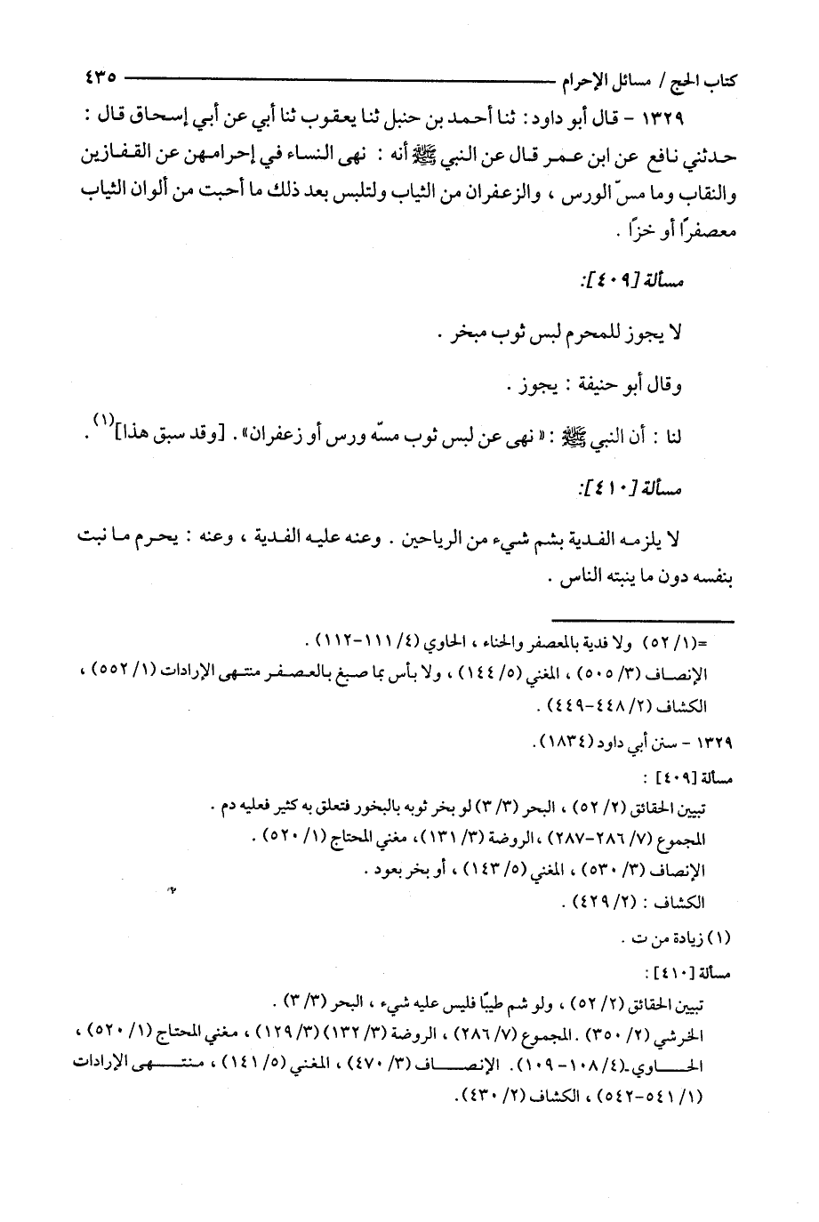 1329 - قال أبو داود : ثنا أحمد بن حنبل ثنا يعقوب ثنا أبي عن أبي إسحاق قال : حدثني نافع عن ابن عمر قال عن النبي أنه : نهى النساء في إحرامهن عن القفازين والنقاب وما مس الورس ، والزعفران من الثياب ولتلبس بعد ذلك ما أحبت من ألوان الثياب معصفرا أو خزا .