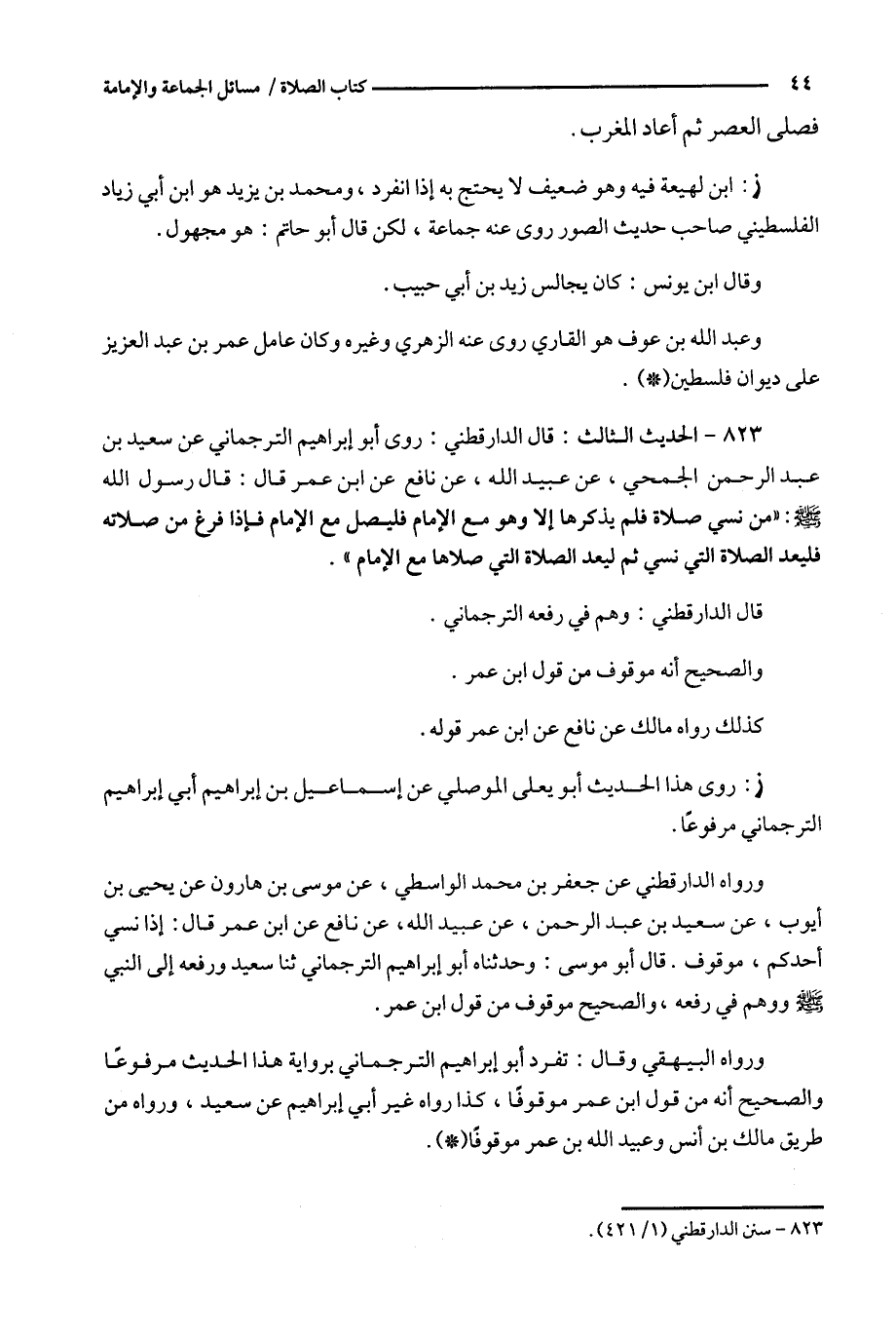 823 - الحديث الثالث : قال الدارقطني : روى أبو إبراهيم الترجماني عن سعيد بن عبد الرحمن الجمحي ، عن عبيد الله ، عن نافع عن ابن عمر قال : قال رسول الله : ' من نسي صلاة فلم يذكرها إلا وهو مع الإمام فليصل مع الإمام فإذا فرغ من صلاته فليعد الصلاة التي نسي ثم ليعد الصلاة التي صلاها مع الإمام ' .