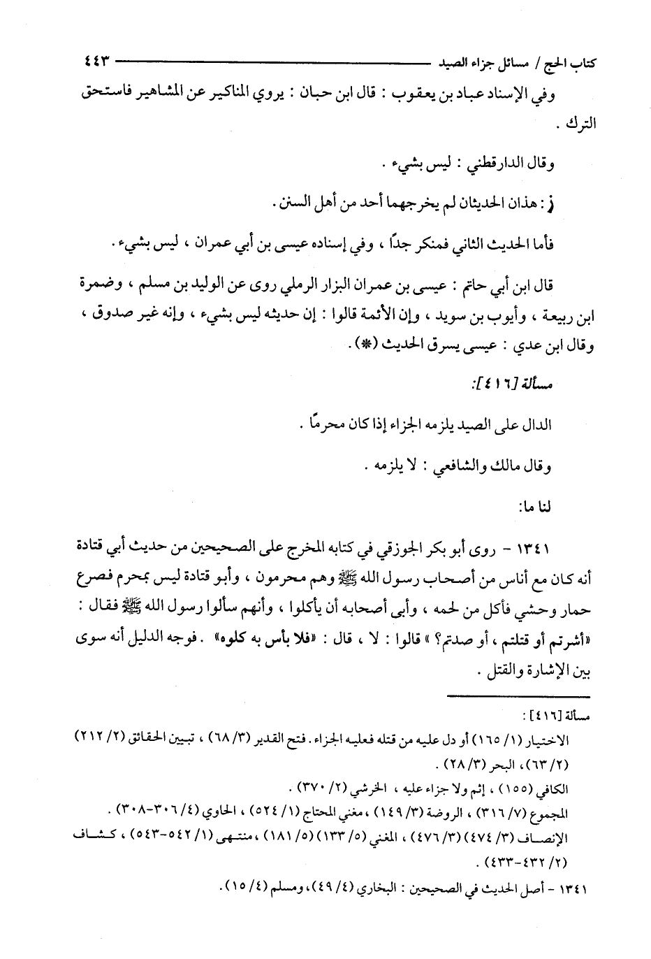 1341 - روى أبو بكر الجوزقي في كتابه المخرج على الصحيحين من حديث أبي قتادة أنه كان مع أناس من أصحاب رسول الله وهم محرمون ، وأبو قتادة ليس بمحرم فصرع حمار وحشي فأكل من لحمه ، وأبى أصحابه أن يأكلوا ، وأنهم سألوا رسول الله فقال : ' أشرتم أو قتلتم ، أو صدتم ؟ ' قالوا : لا ، قال : ' فلا بأس به كلوه ' .