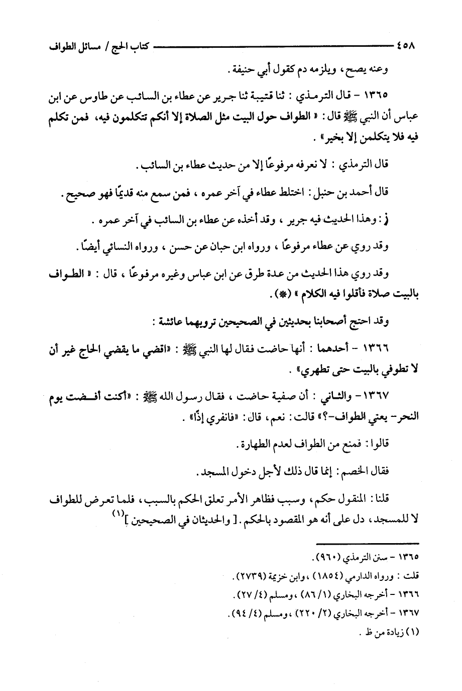 1365 - قال الترمذي : ثنا قتيبة ثنا جرير عن عطاء بن السائب عن طاوس عن ابن عباس أن النبي قال : ' الطواف حول البيت مثل الصلاة إلا أنكم تتكلمون فيه ، فمن تكلم فيه فلا يتكلمن إلا بخير ' .