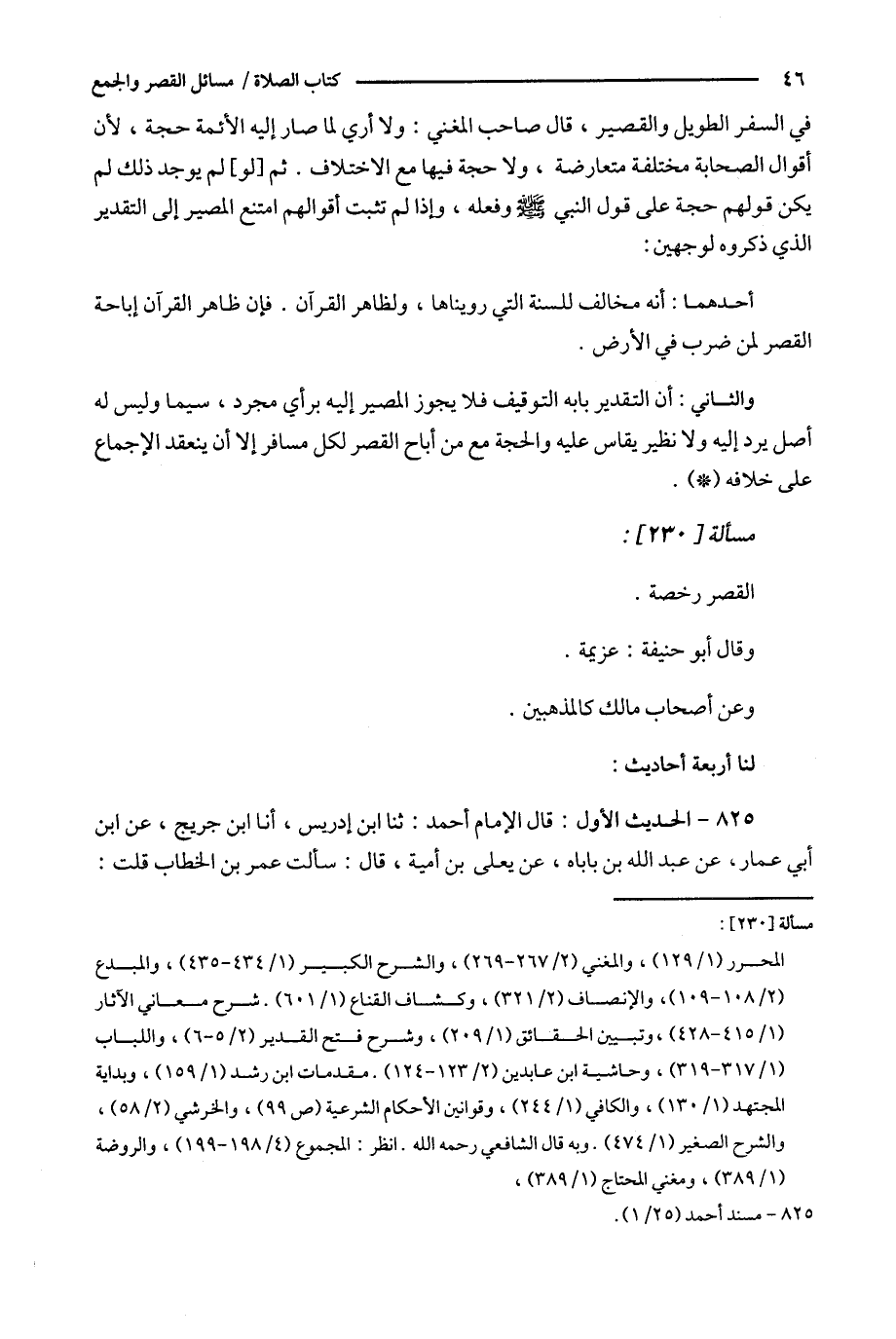 في السفر الطويل والقصير ، قال صاحب المغني : ولا أري لما صار إليه الأئمة حجة ، لأن أقوال الصحابة مختلفة متعارضة ، ولا حجة فيها مع الاختلاف .
