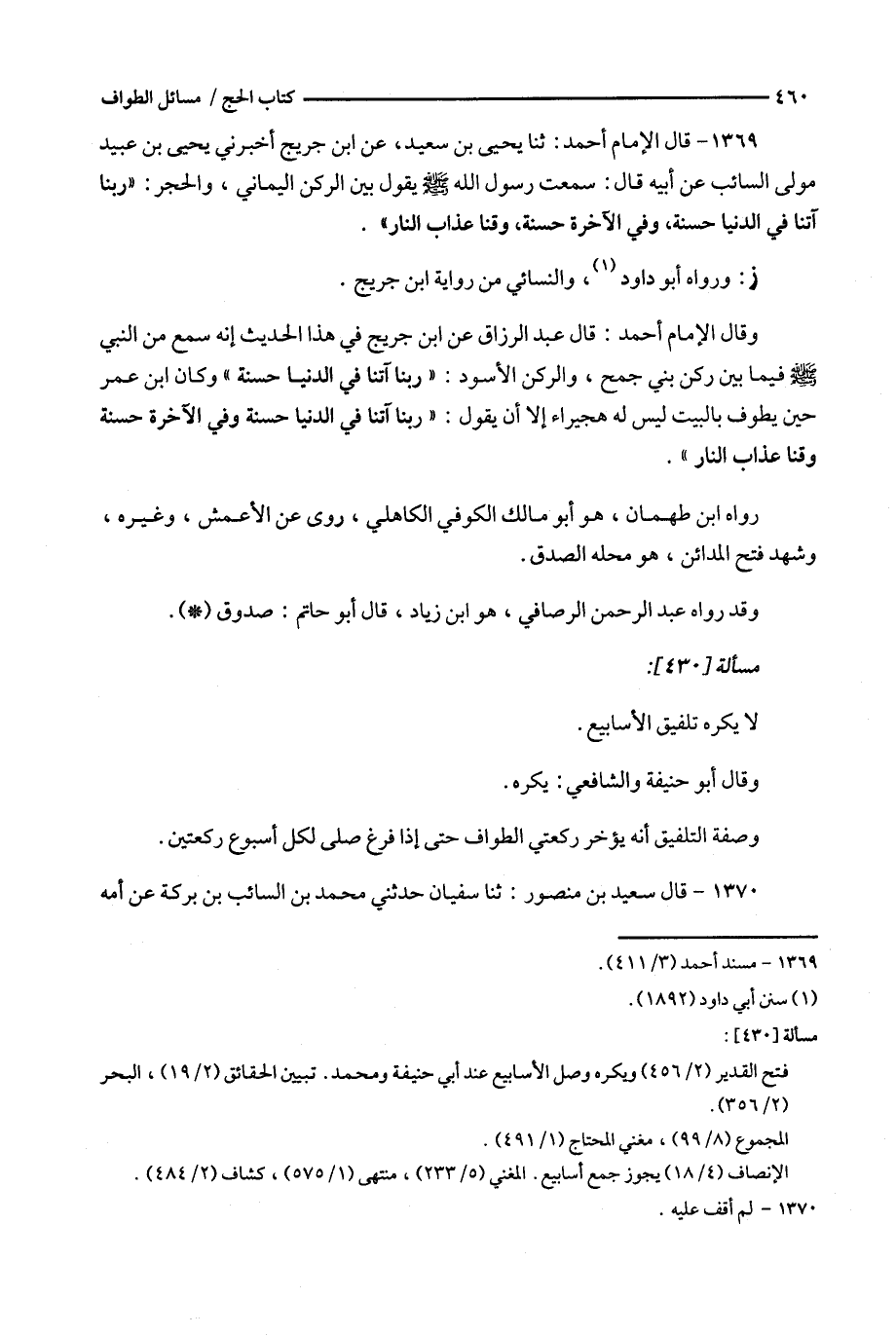 1369 - قال الإمام أحمد : ثنا يحيى بن سعيد ، عن ابن جريج أخبرني يحيى بن عبيد مولى السائب عن أبيه قال : سمعت رسول الله يقول بين الركن اليماني ، والحجر : ' ربنا آتنا في الدنيا حسنة ، وفي الآخرة حسنة ، وقنا عذاب النار ' .