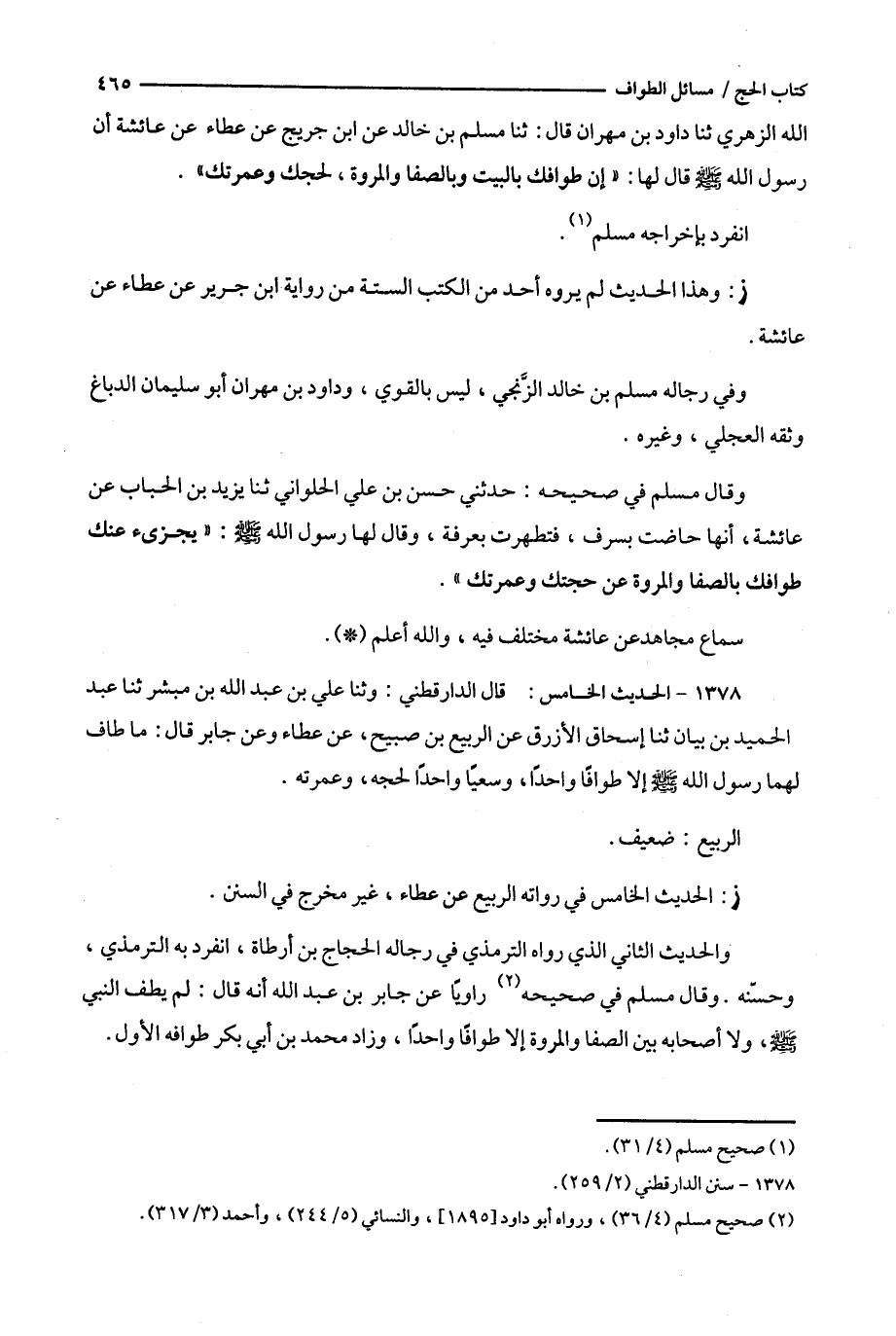 وقال مسلم في صحيحه راويا عن جابر بن عبد الله أنه قال : لم يطف النبي ، ولا أصحابه بين الصفا والمروة إلا طوافا واحدا ، وزاد محمد بن أبي بكر طوافه الأول .