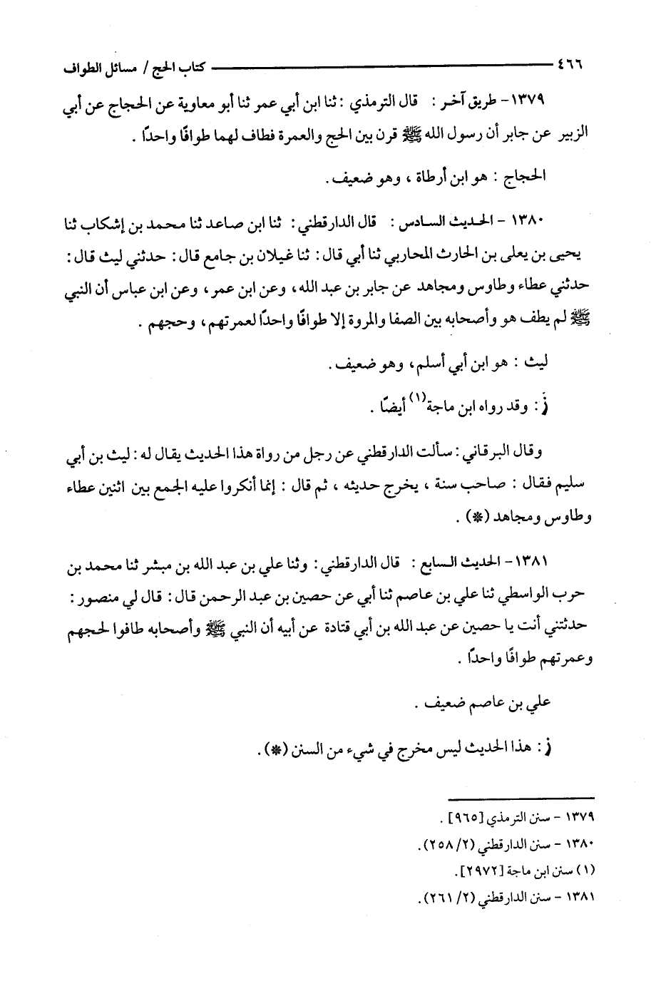 1380 - الحديث السادس : قال الدارقطني : ثنا ابن صاعد ثنا محمد بن إشكاب ثنا يحي بن يعلى بن الحارث المحاربي ثنا أبي قال : ثنا غيلان بن جامع قال : حدثني ليث قال : حدثني عطاء وطاوس ومجاهد عن جابر بن عبد الله ، وعن ابن عمر ، وعن ابن عباس أن النبي لم يطف هو وأصحابه بين الصفا والمروة إلا طوافا واحدا لعمرتهم ، وحجهم .
