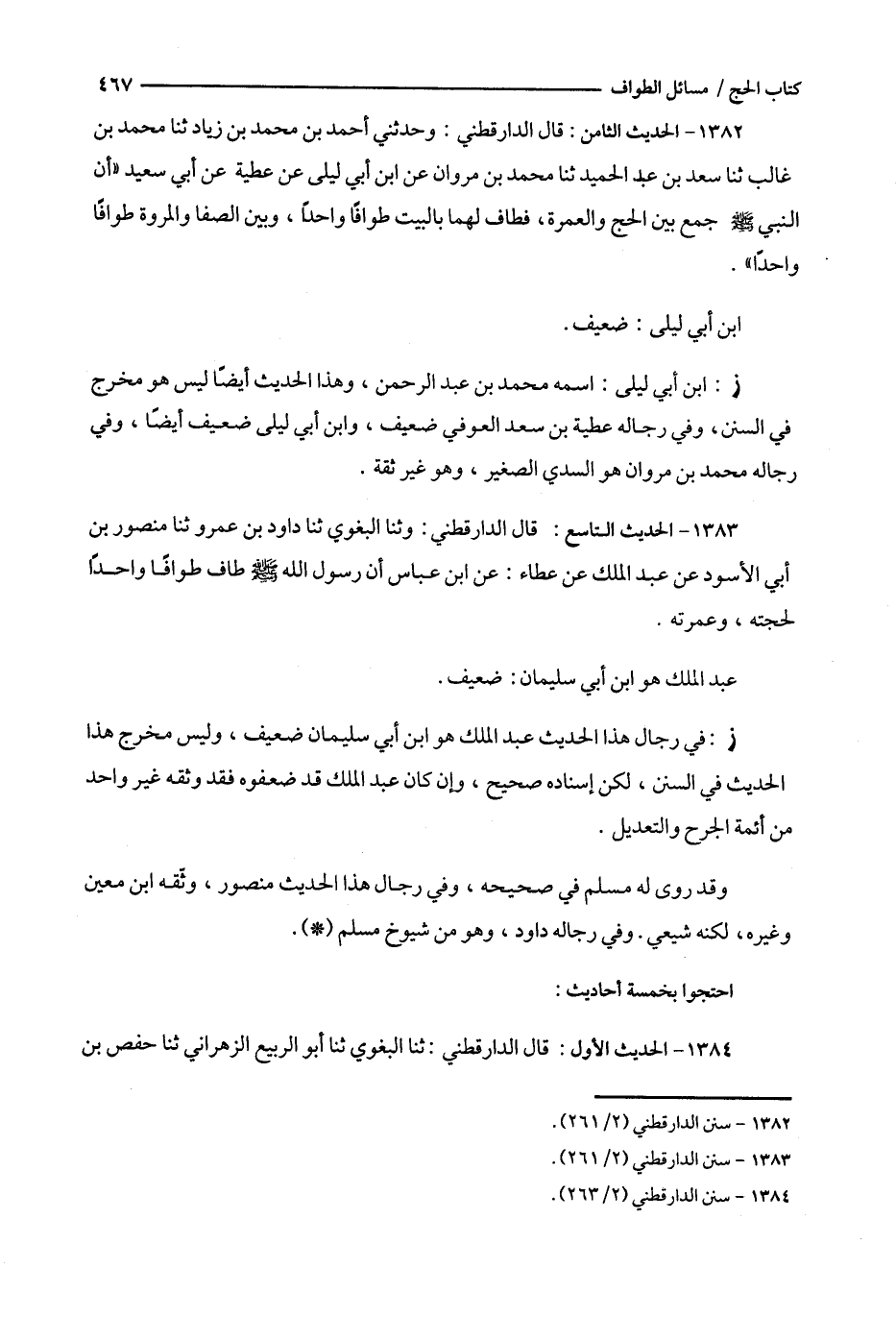 1383 - الحديث التاسع : قال الدارقطني : وثنا البغوي ثنا داود بن عمرو ثنا منصور بن أبي الأسود عن عبد الملك عن عطاء : عن ابن عباس أن رسول الله طاف طوافا واحدا لحجته ، وعمرته .