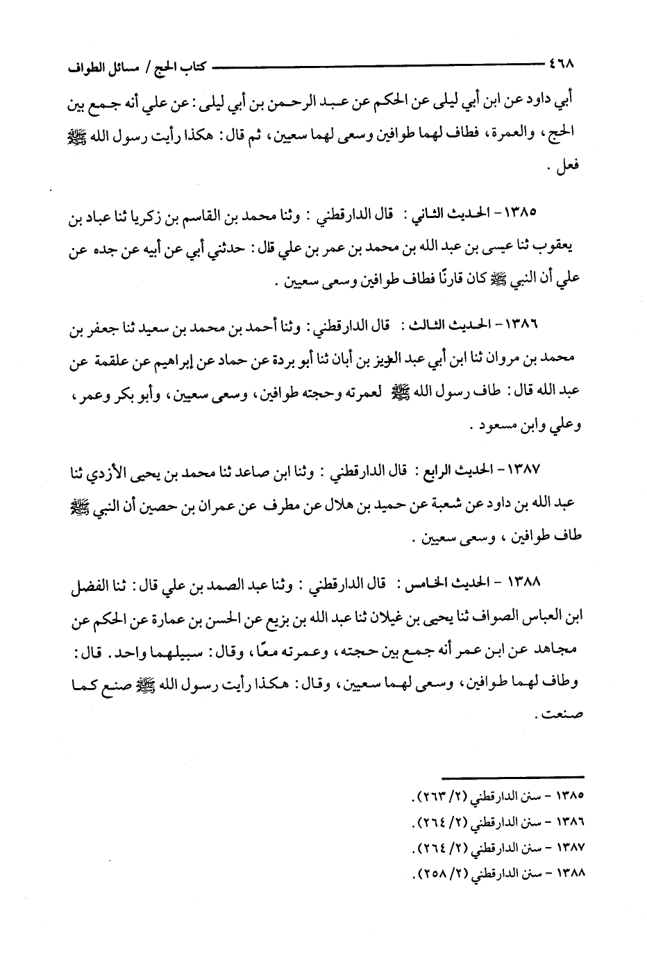 1387 - الحديث الرابع : قال الدارقطني : وثنا ابن صاعد ثنا محمد بن يحيى الأزدي ثنا عبد الله بن داود عن شعبة عن حميد بن هلال عن مطرف عن عمران بن حصين أن النبي طاف طوافين ، وسعى سعيين .